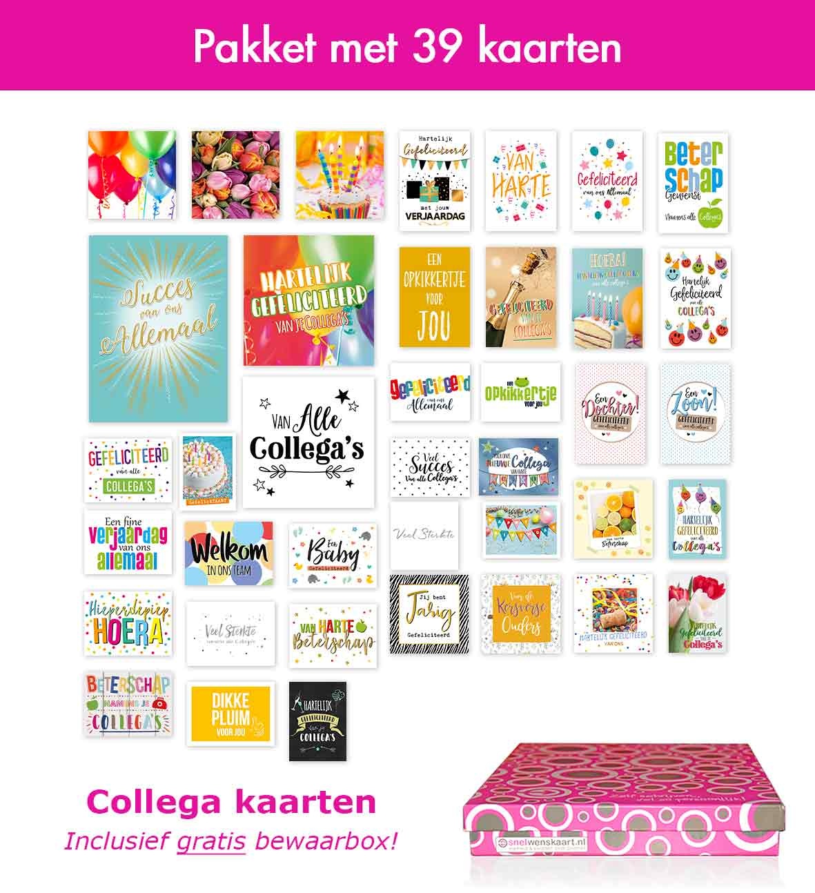 Ideaal voor uw bedrijf! Een uitgebreid pakket met sympathieke collega wenskaarten voor de meest betekenisvolle gelegenheden. Zo grijpt u nooit mis bij een belangrijke gebeurtenis. Alle 39 wenskaarten zijn voorzien van een envelop.