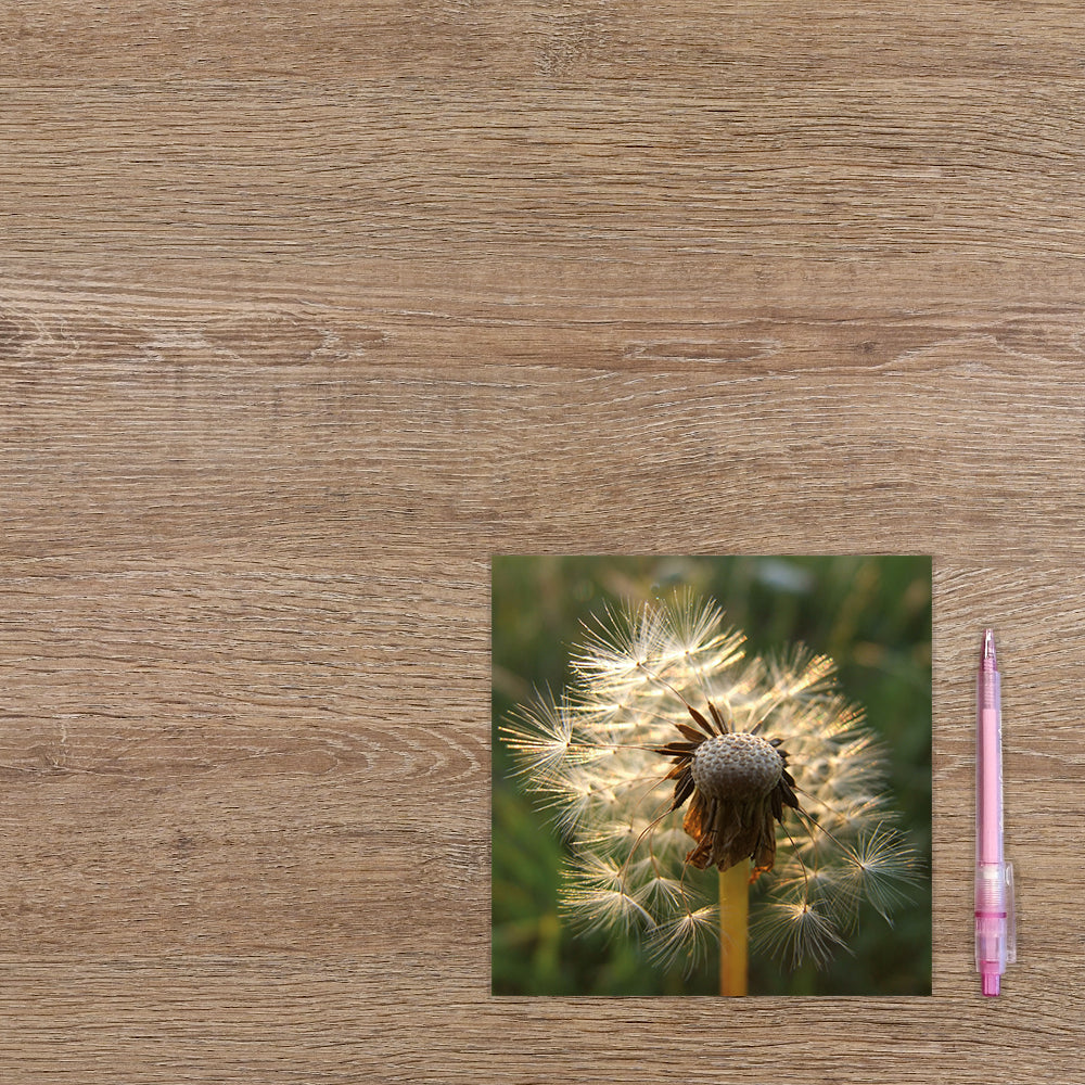 De wenskaart heeft een afmeting van x en een vierkante vorm. Op deze wenskaart staat een foto van een paardenbloem. De binnenzijde van de wenskaart is blanco wat voldoende ruimte geeft om een persoonlijke boodschap te schrijven .