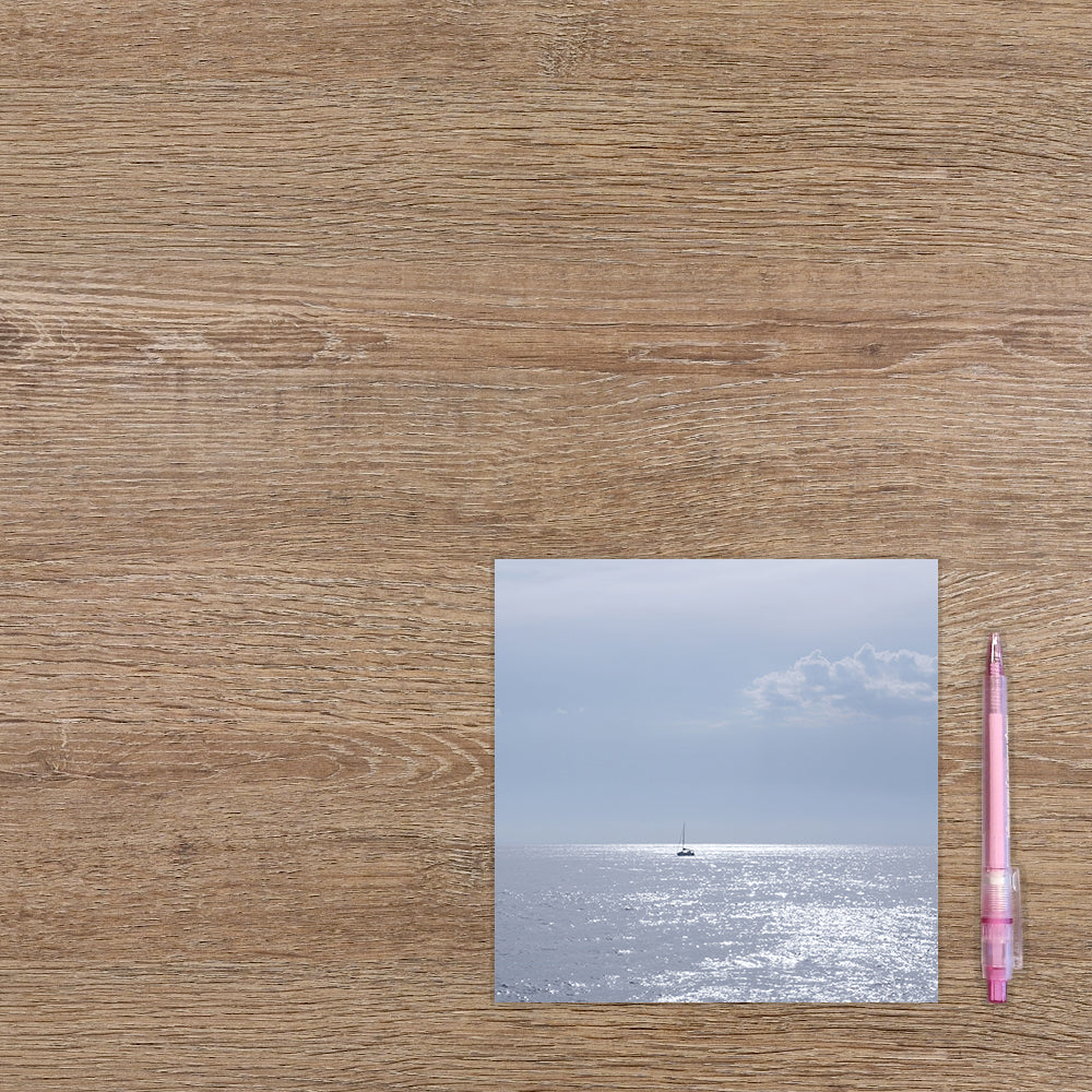 De wenskaart heeft een afmeting van x en een vierkante vorm. Op deze wenskaart staat een foto van de zee waar een zeilboot op vaart. De binnenzijde van de wenskaart is blanco wat voldoende ruimte geeft om een persoonlijke boodschap te schrijven .