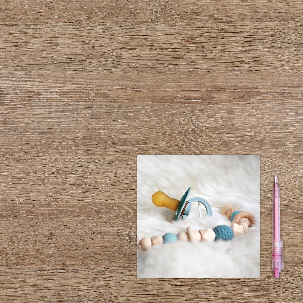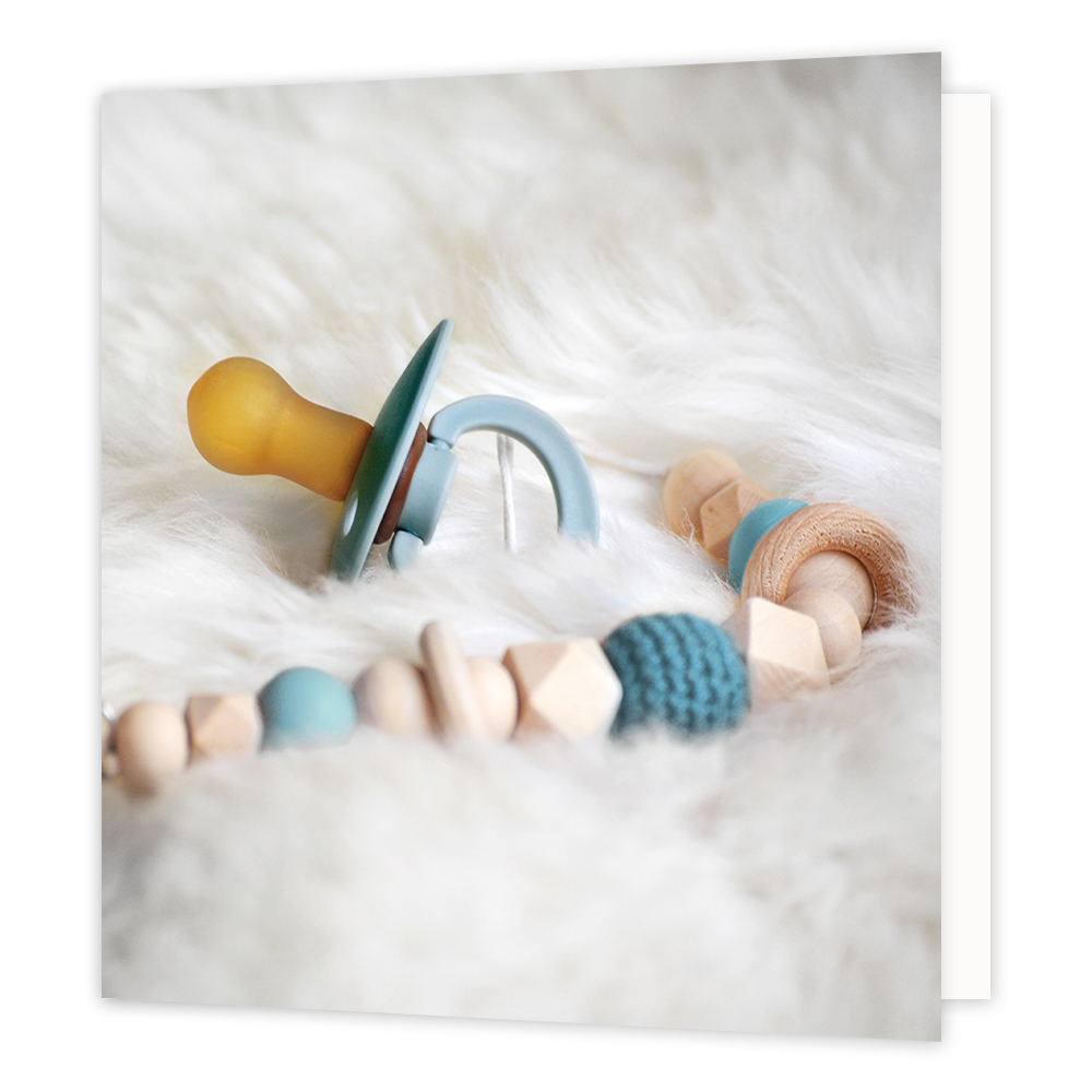 De wenskaart heeft een afmeting van x en een vierkante vorm. Op deze wenskaart staat een foto van een blauwe babyspeen. De binnenzijde van de wenskaart is blanco wat voldoende ruimte geeft om een persoonlijke boodschap te schrijven .