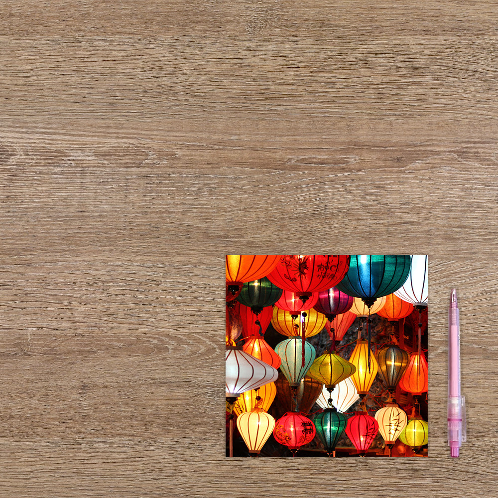 De wenskaart heeft een afmeting van x en een vierkante vorm. Op deze wenskaart staat een foto van lampionnen in diverse soorten kleuren en vormen. De binnenzijde van de wenskaart is blanco wat voldoende ruimte geeft om een persoonlijke boodschap te schrijven .