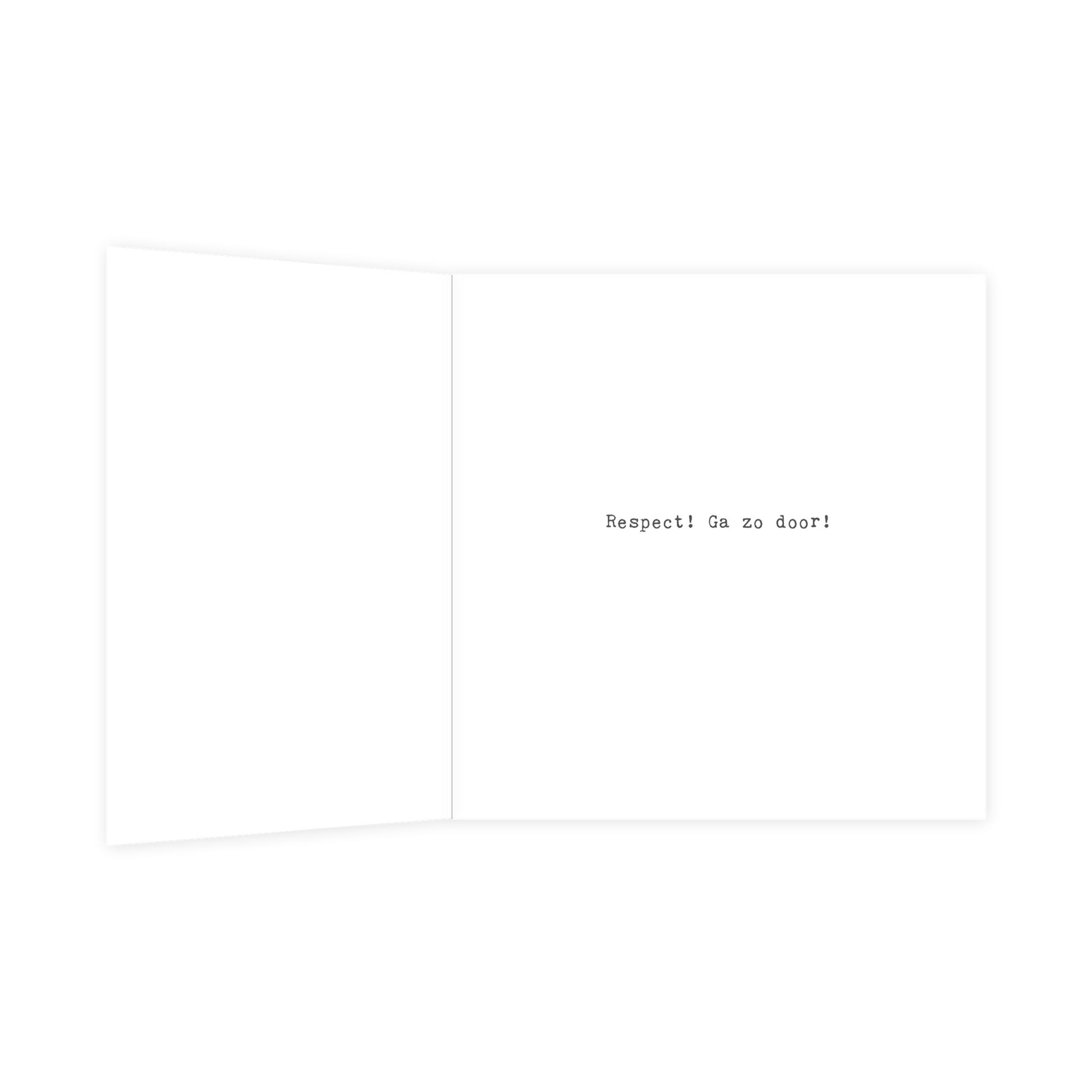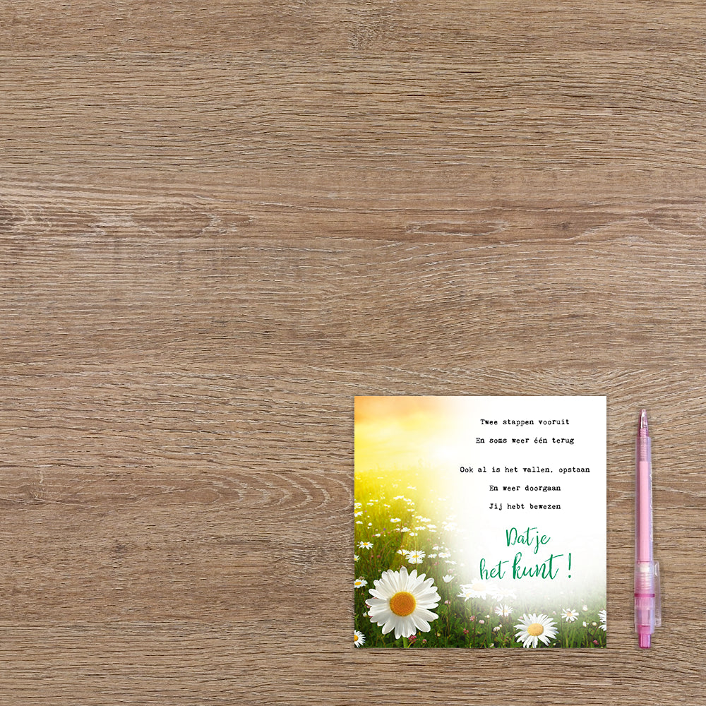De wenskaart heeft een afmeting van x en een vierkante vorm. Op deze wenskaart staat een bloemenveld met madeliefjes. In de illustratie staat de tekst: "Twee stappen vooruit en soms weer één terug. Ook al is het vallen, opstaan en weer doorgaan, jij hebt bewezen dat je het kunt!" De binnenzijde van de wenskaart is bedrukt met de tekst "Respect! Ga zo door!".