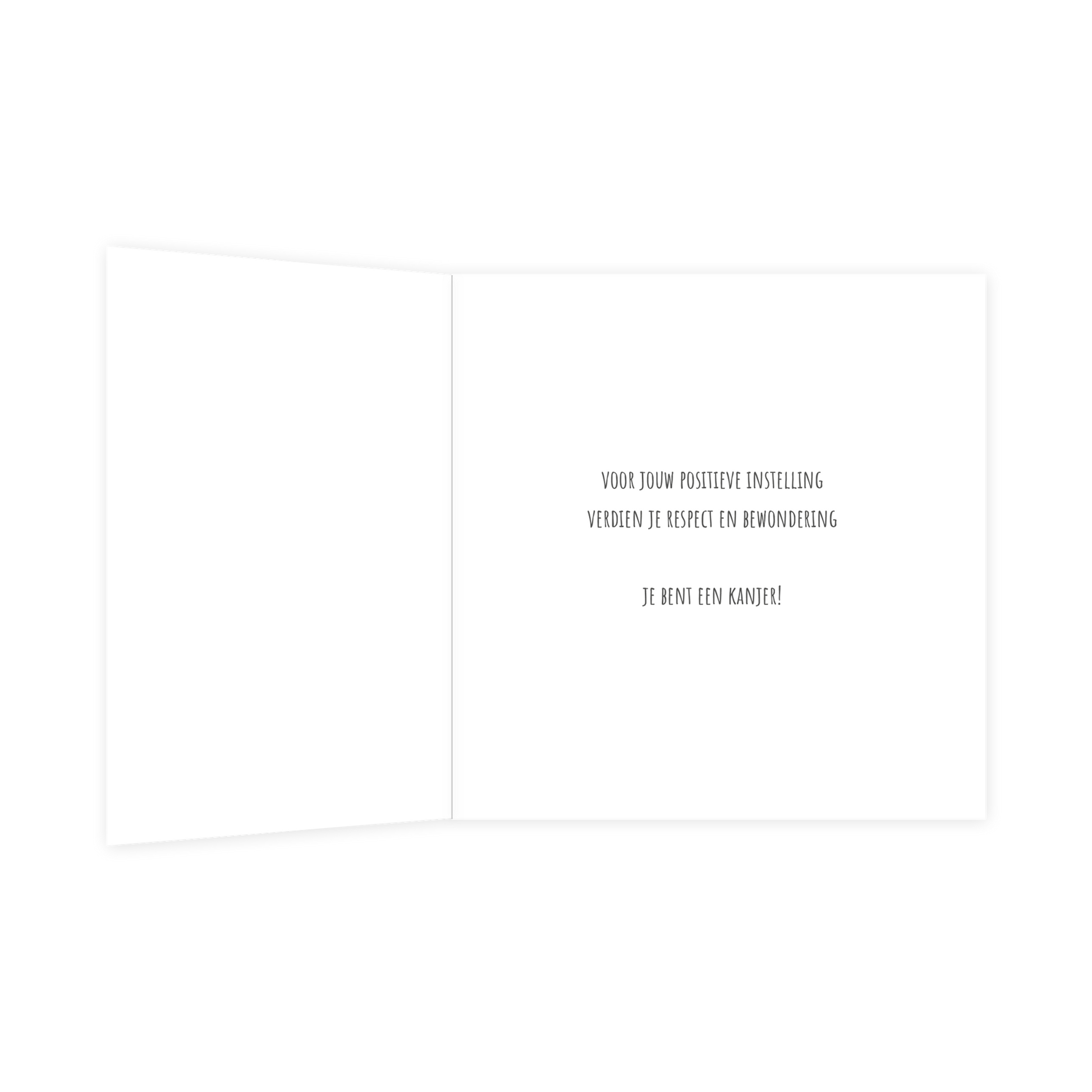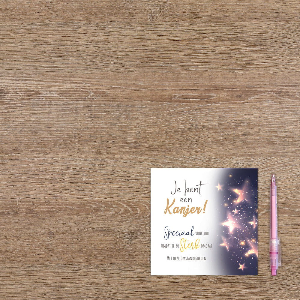 De wenskaart heeft een afmeting van x en een vierkante vorm. Op deze wenskaart staat de ruimte met sterren en daarnaast de tekst: "Je bent een kanjer! Speciaal voor jou omdat je zo sterk omgaat met deze omstandigheden". De binnenzijde van de wenskaart is bedrukt met de tekst "Voor jouw positieve instelling verdien je respect en bewondering. Je bent een kanjer!".