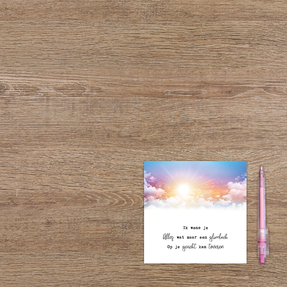 De wenskaart heeft een afmeting van x en een vierkante vorm. Op deze wenskaart staat de zon die boven de wolken uitschijnt. Daaronder staat de tekst: "Ik wens je alles wat maar een glimlach op je gezicht kan toveren". De binnenzijde van de wenskaart is blanco wat voldoende ruimte geeft om een persoonlijke boodschap te schrijven .