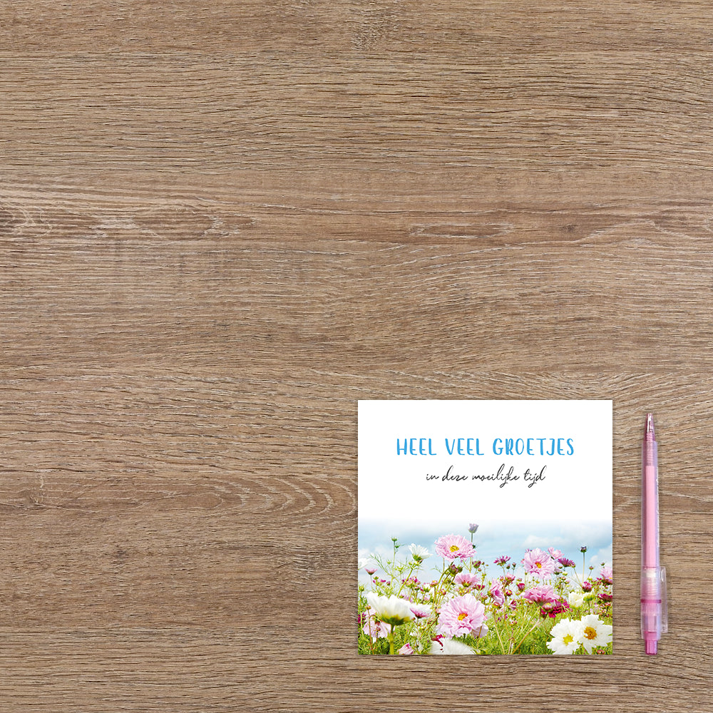 De wenskaart heeft een afmeting van x en een vierkante vorm. Op deze wenskaart staat een bloemenveld met daarboven de tekst: "Heel veel groetjes in deze moeilijke tijd". De binnenzijde van de wenskaart is blanco wat voldoende ruimte geeft om een persoonlijke boodschap te schrijven .