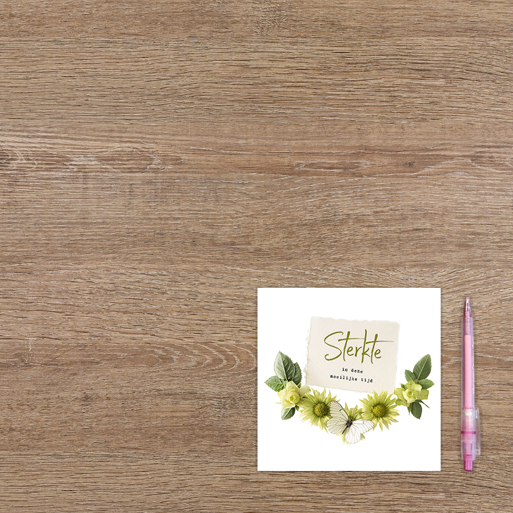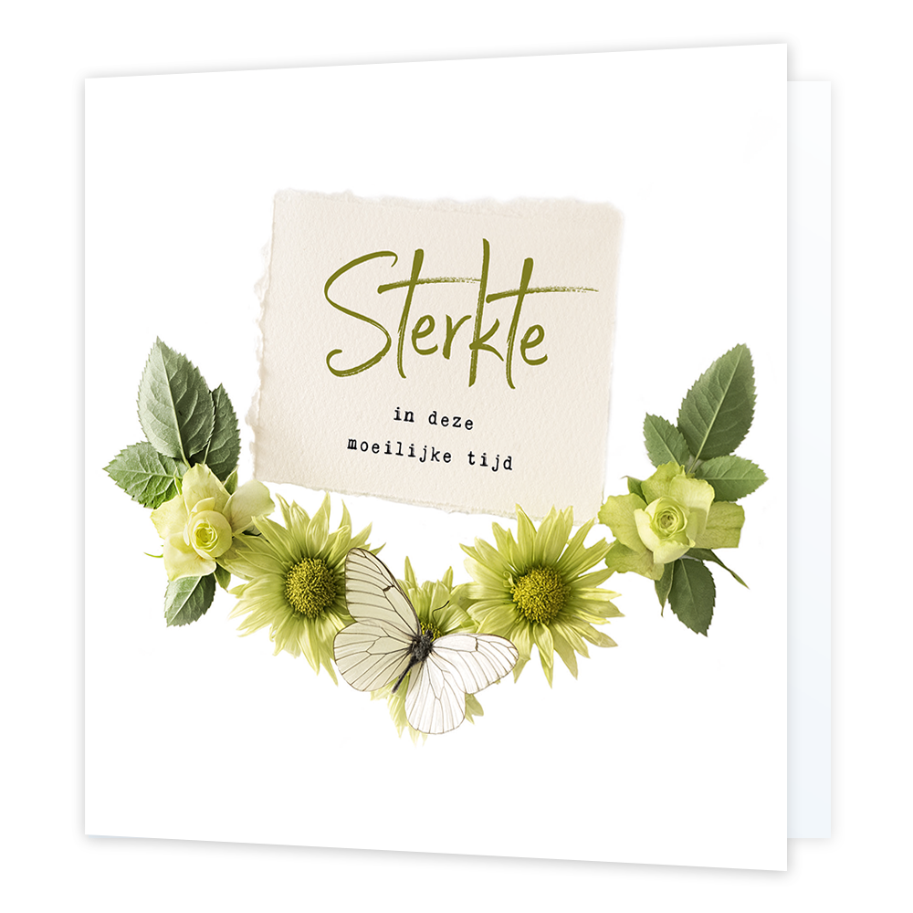 De wenskaart heeft een afmeting van x en een vierkante vorm. Op deze wenskaart staat een bloemenkrans met een vlinder en in het midden een kaartje met de tekst: "Sterkte in deze moeilijke tijd". De binnenzijde van de wenskaart is blanco wat voldoende ruimte geeft om een persoonlijke boodschap te schrijven .