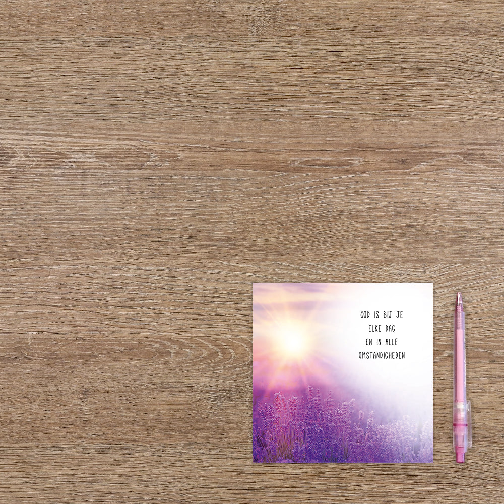 De wenskaart heeft een afmeting van x en een vierkante vorm. Op deze wenskaart staat een veld met lavendel waar de zon over schijnt. In de illustratie staat de tekst: "God is bij je elke dag en in alle omstandigheden". De binnenzijde van de wenskaart is blanco wat voldoende ruimte geeft om een persoonlijke boodschap te schrijven .