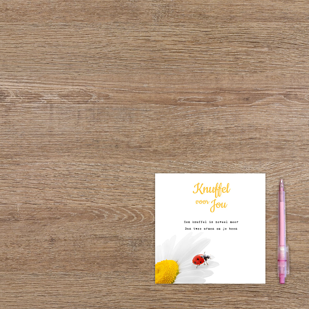 De wenskaart heeft een afmeting van x en een vierkante vorm. Op deze wenskaart staat een lieveheersbeestje op een witte bloem met daarboven de tekst: "Knuffel voor jou. Een knuffel is zoveel meer dan twee armen om je heen". De binnenzijde van de wenskaart is bedrukt met de tekst "Het is een stille fluistering die zegt: Je bent belangrijk voor me. Ik zal er altijd voor je zijn".