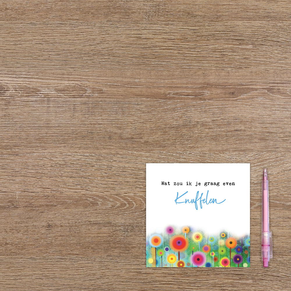 De wenskaart heeft een afmeting van x en een vierkante vorm. Op deze artistieke wenskaart staat een ontwerp met de kleuren rood, paars, geel, oranje, groen en blauw. Daarboven staat de tekst: "Wat zou ik je graag even knuffelen". De binnenzijde van de wenskaart is blanco wat voldoende ruimte geeft om een persoonlijke boodschap te schrijven .