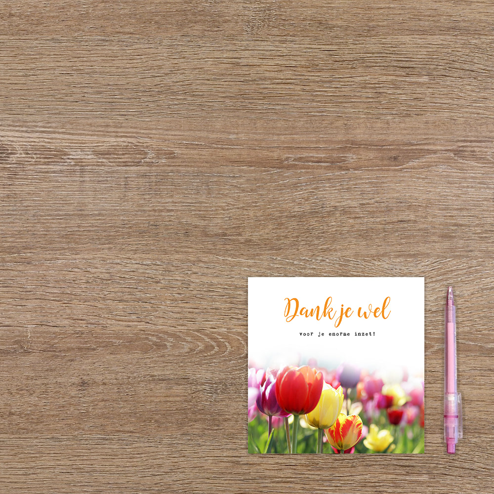 De wenskaart heeft een afmeting van x en een vierkante vorm. Op deze wenskaart staat een tulpenveld met daarboven de tekst: "Dank je wel voor je enorme inzet!". De binnenzijde van de wenskaart is blanco wat voldoende ruimte geeft om een persoonlijke boodschap te schrijven .