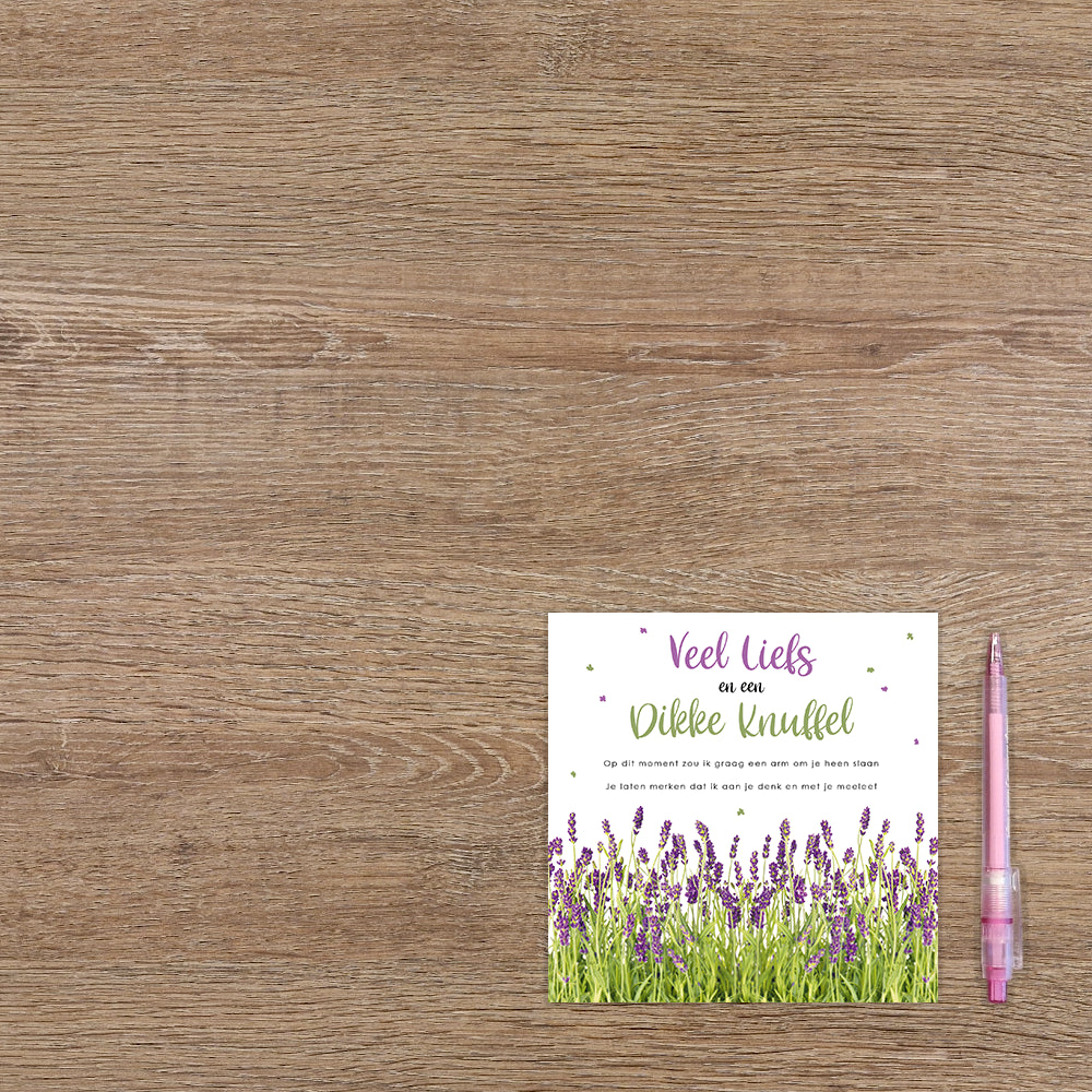 De wenskaart heeft een afmeting van x en een vierkante vorm. Op deze wenskaart staat een lavendelveld met daarboven de tekst: "Veel liefs en een dikke knuffel. Op dit moment zou ik graag een arm om je heen slaan, je laten merken dat ik aan je denk en met je meeleef". De binnenzijde van de wenskaart is bedrukt met de tekst "Daarom deze kaart met lieve wensen en een dikke knuffel voor jou"..