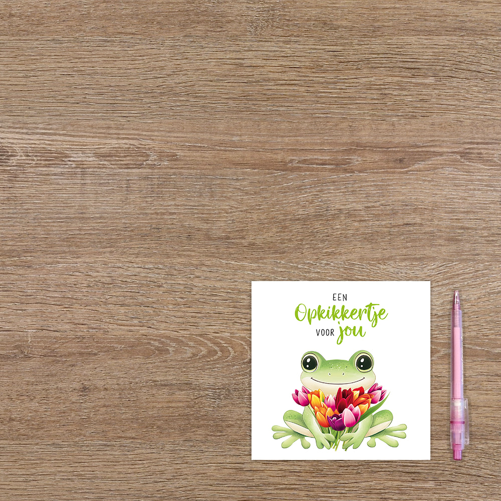 De wenskaart heeft een afmeting van x en een vierkante vorm. Op deze wenskaart is een kikker te zien die een bos tulpen in de kleuren roze, oranje, rood en paas vasthoudt, op een witte achtergrond. Boven de kikker staat de tekst:: "Een opkikkertje voor jou". De binnenzijde van de wenskaart is blanco wat voldoende ruimte geeft om een persoonlijke boodschap te schrijven .