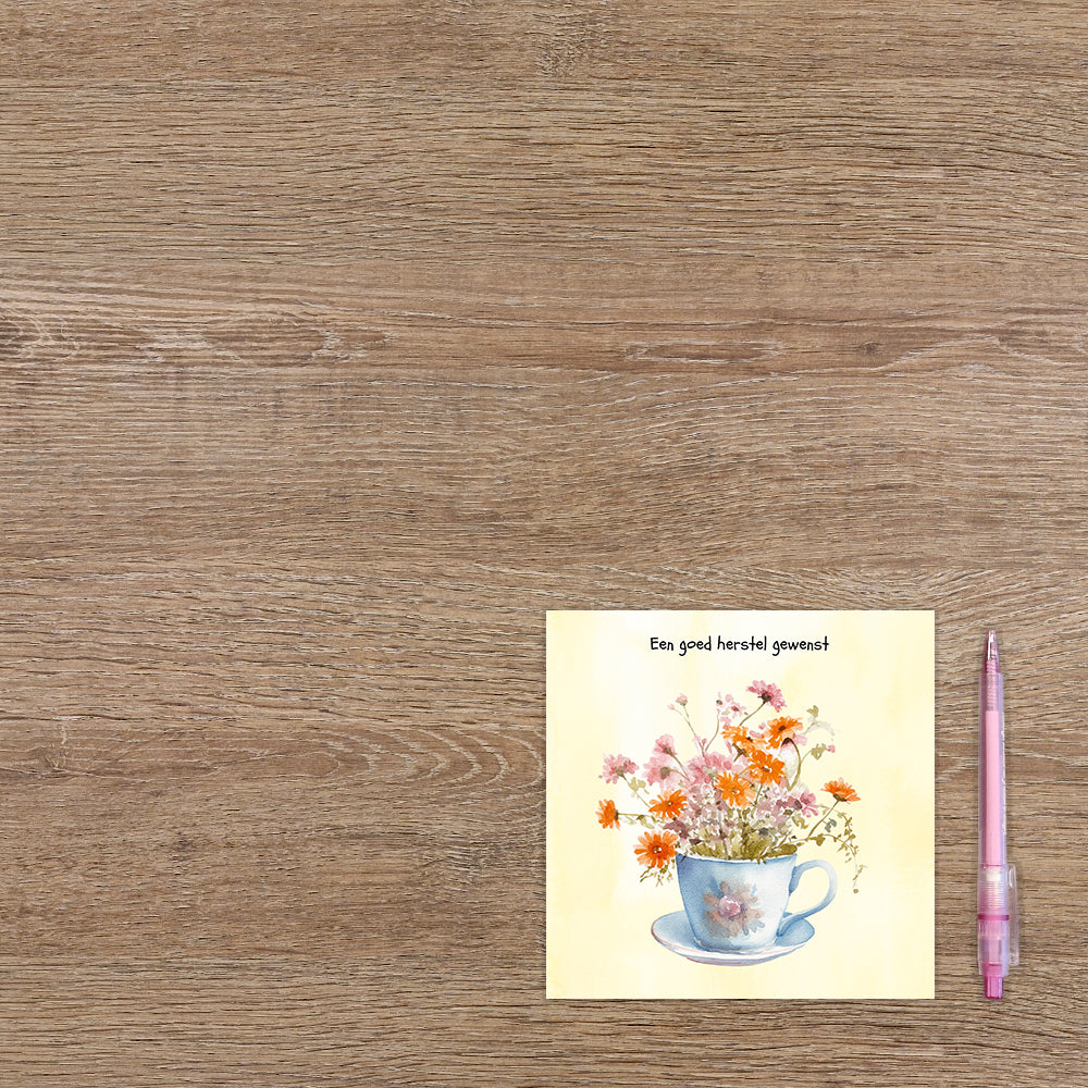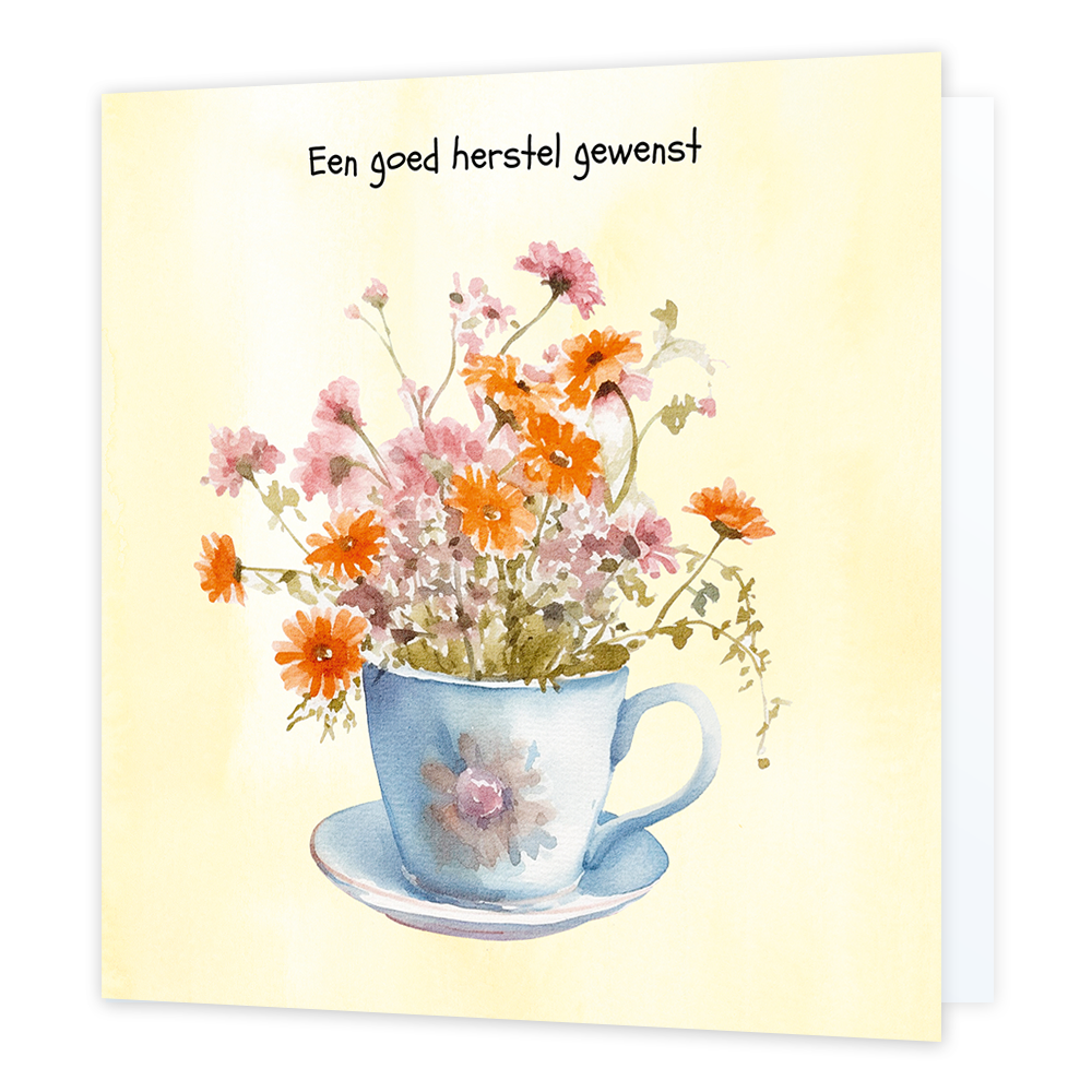 De wenskaart heeft een afmeting van x en een vierkante vorm. Op deze wenskaart staat een kopje waar bloemen uit komen. Boven de illustratie staat de tekst: "Een goed herstel gewenst". De binnenzijde van de wenskaart is blanco wat voldoende ruimte geeft om een persoonlijke boodschap te schrijven .