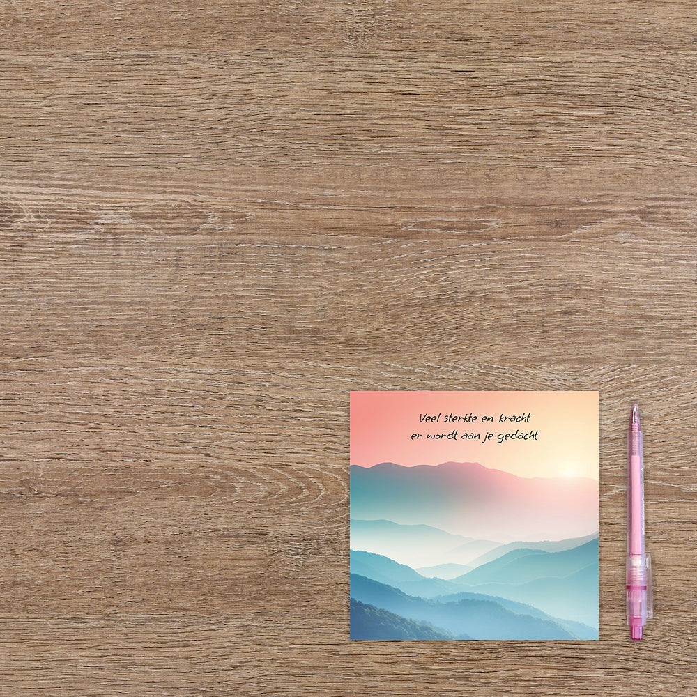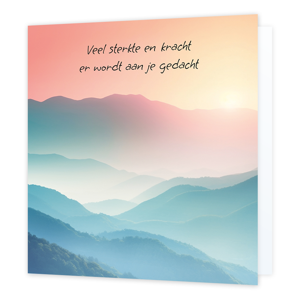 De wenskaart heeft een afmeting van x en een vierkante vorm. Op deze wenskaart staat een berglandschap met daarboven de tekst: "Veel sterkte en kracht er wordt aan je gedacht". De binnenzijde van de wenskaart is blanco wat voldoende ruimte geeft om een persoonlijke boodschap te schrijven .