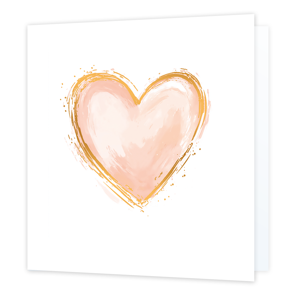 De wenskaart heeft een afmeting van x en een vierkante vorm. Op deze wenskaart is een roze hart te zien met gouden omlijning, op een witte achtergrond. De binnenzijde van de wenskaart is blanco wat voldoende ruimte geeft om een persoonlijke boodschap te schrijven .