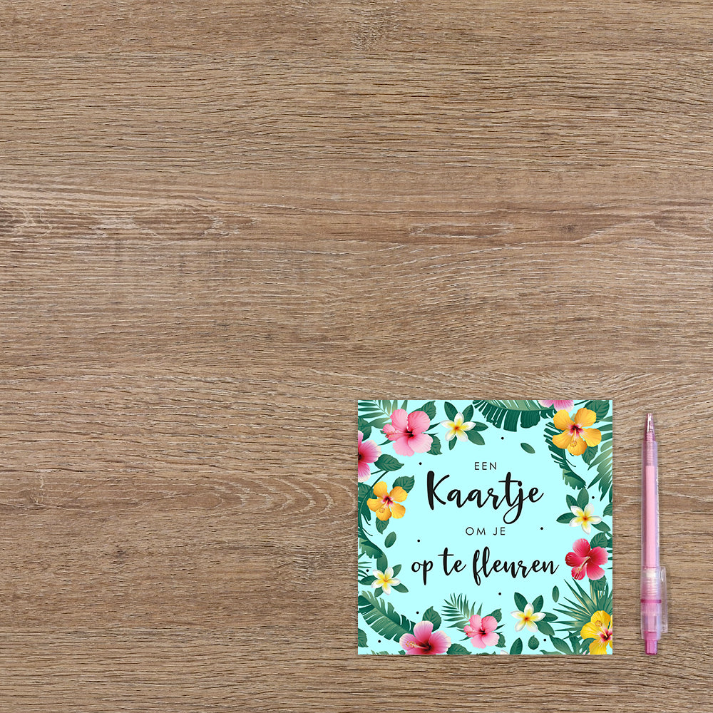 De wenskaart heeft een afmeting van x en een vierkante vorm. Op deze wenskaart staan bloemen in de kleuren oranje, roze en wit, omringt door groene bladeren. In het midden staat de tekst: "Een kaartje om je op te fleuren". De binnenzijde van de wenskaart is blanco wat voldoende ruimte geeft om een persoonlijke boodschap te schrijven .