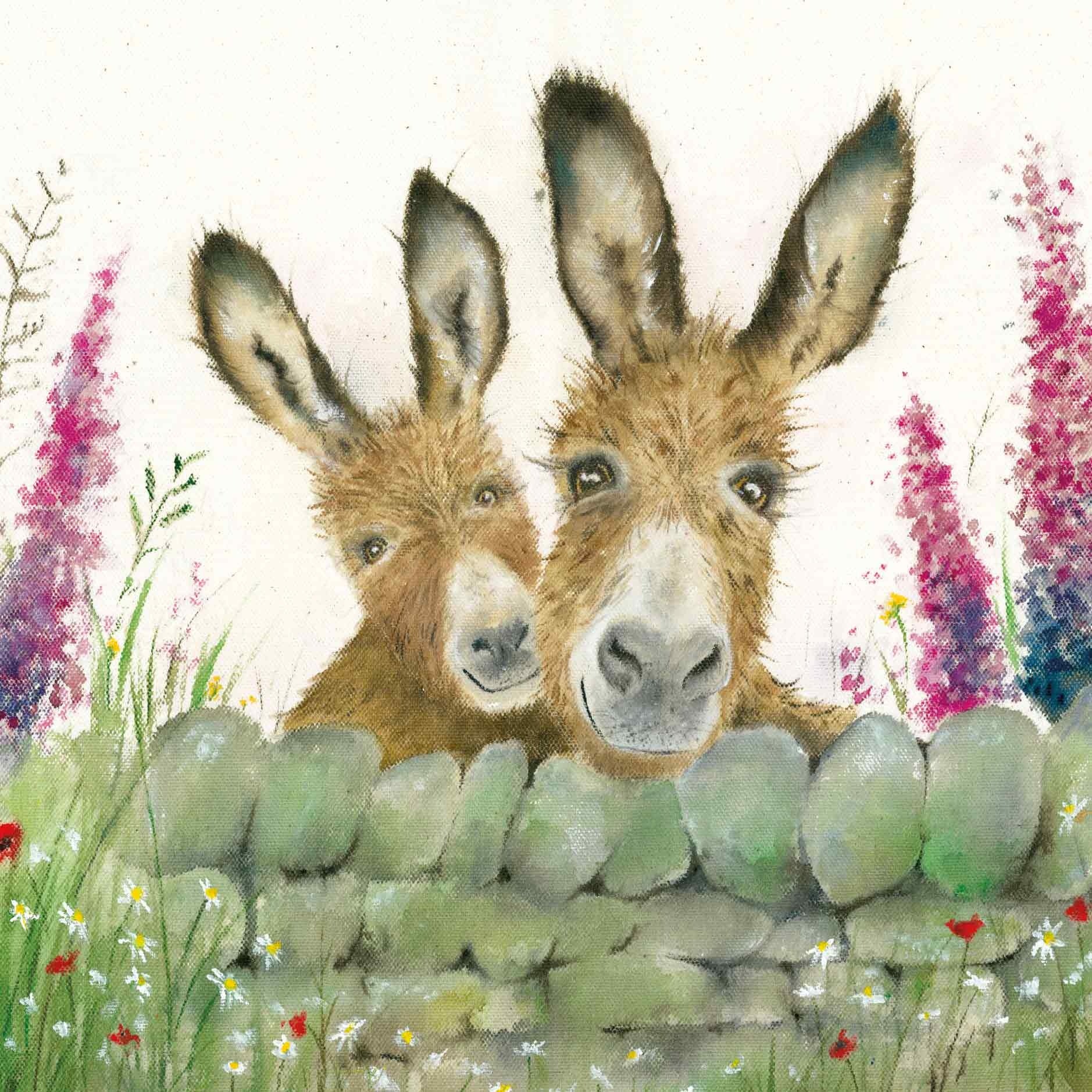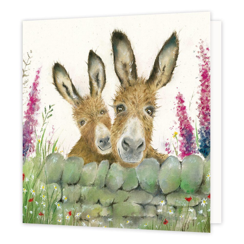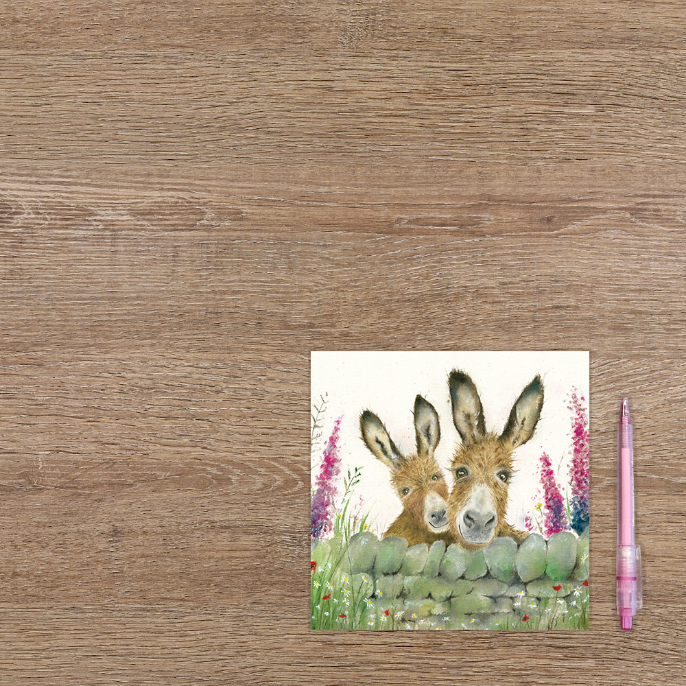 De wenskaart heeft een afmeting van x en een vierkante vorm. Op deze wenskaart staan twee ezeltjes die over een stenen muur heen kijken. De binnenzijde van de wenskaart is blanco wat voldoende ruimte geeft om een persoonlijke boodschap te schrijven .