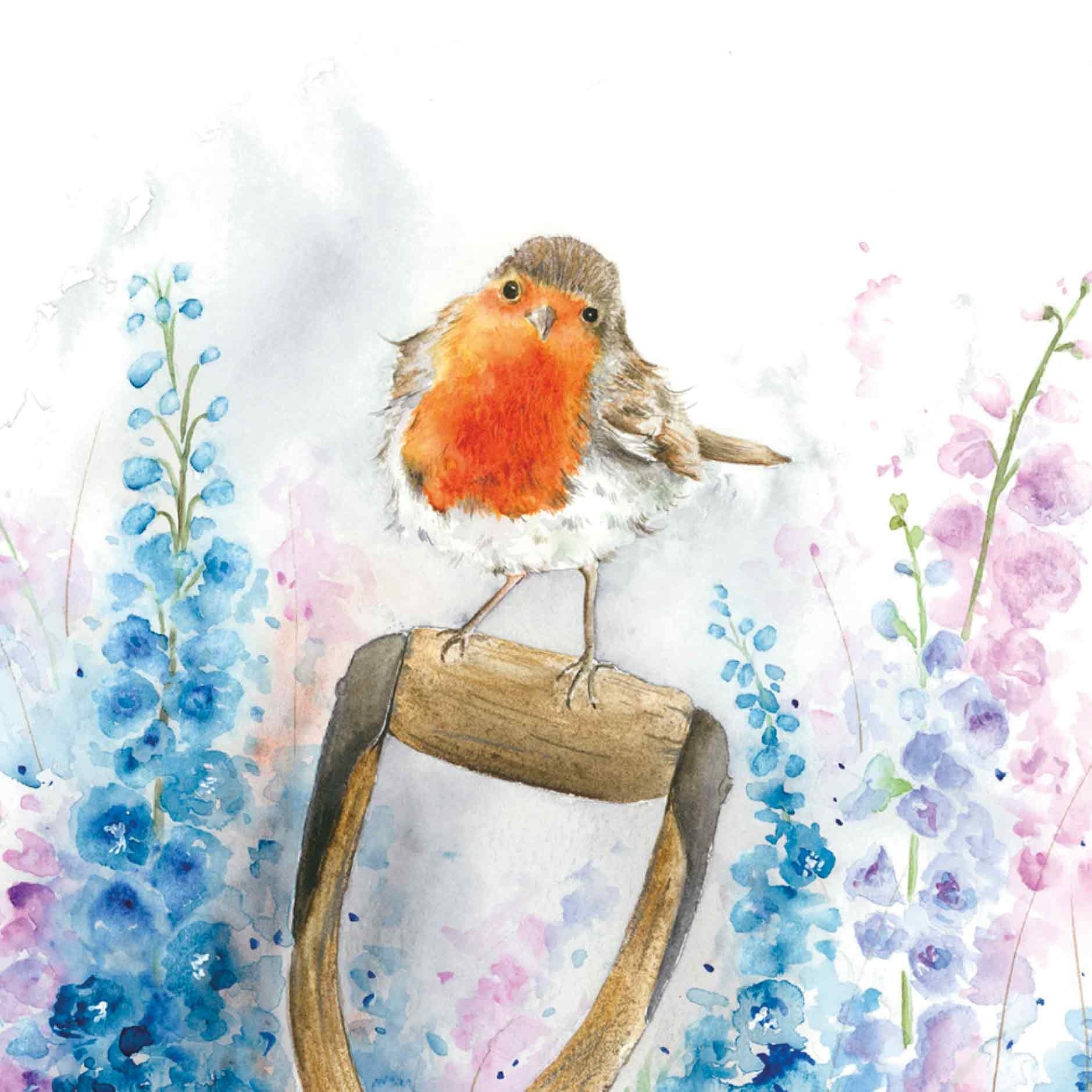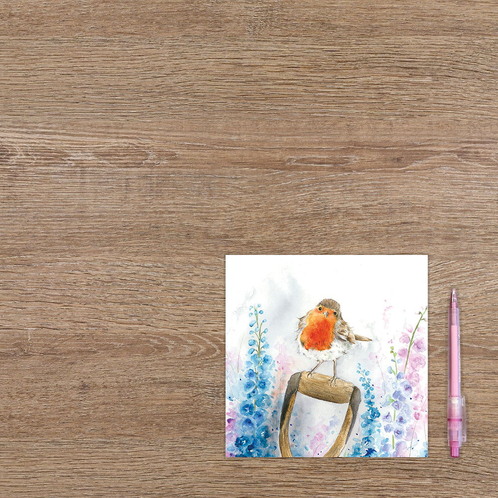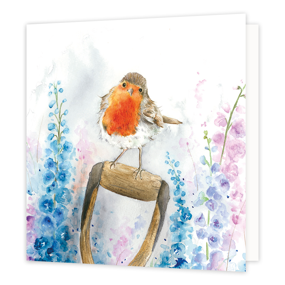 De wenskaart heeft een afmeting van x en een vierkante vorm. Op deze wenskaart staat een roodborstje omringt door blauwe, paarse en roze bloemen. De binnenzijde van de wenskaart is blanco wat voldoende ruimte geeft om een persoonlijke boodschap te schrijven .