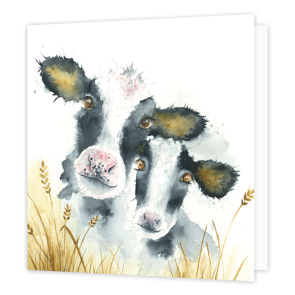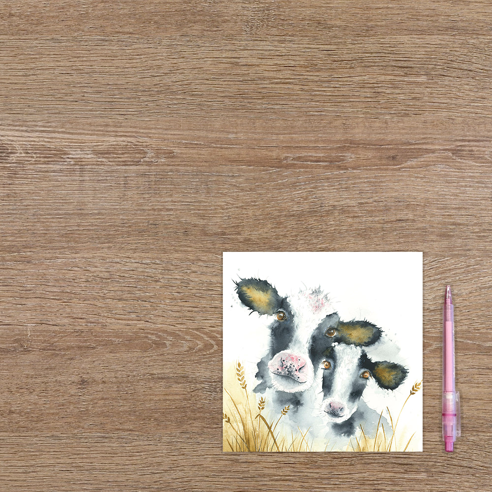 De wenskaart heeft een afmeting van x en een vierkante vorm. Op deze wenskaart staan twee koeien die boven het gras uitkijken. De binnenzijde van de wenskaart is blanco wat voldoende ruimte geeft om een persoonlijke boodschap te schrijven .