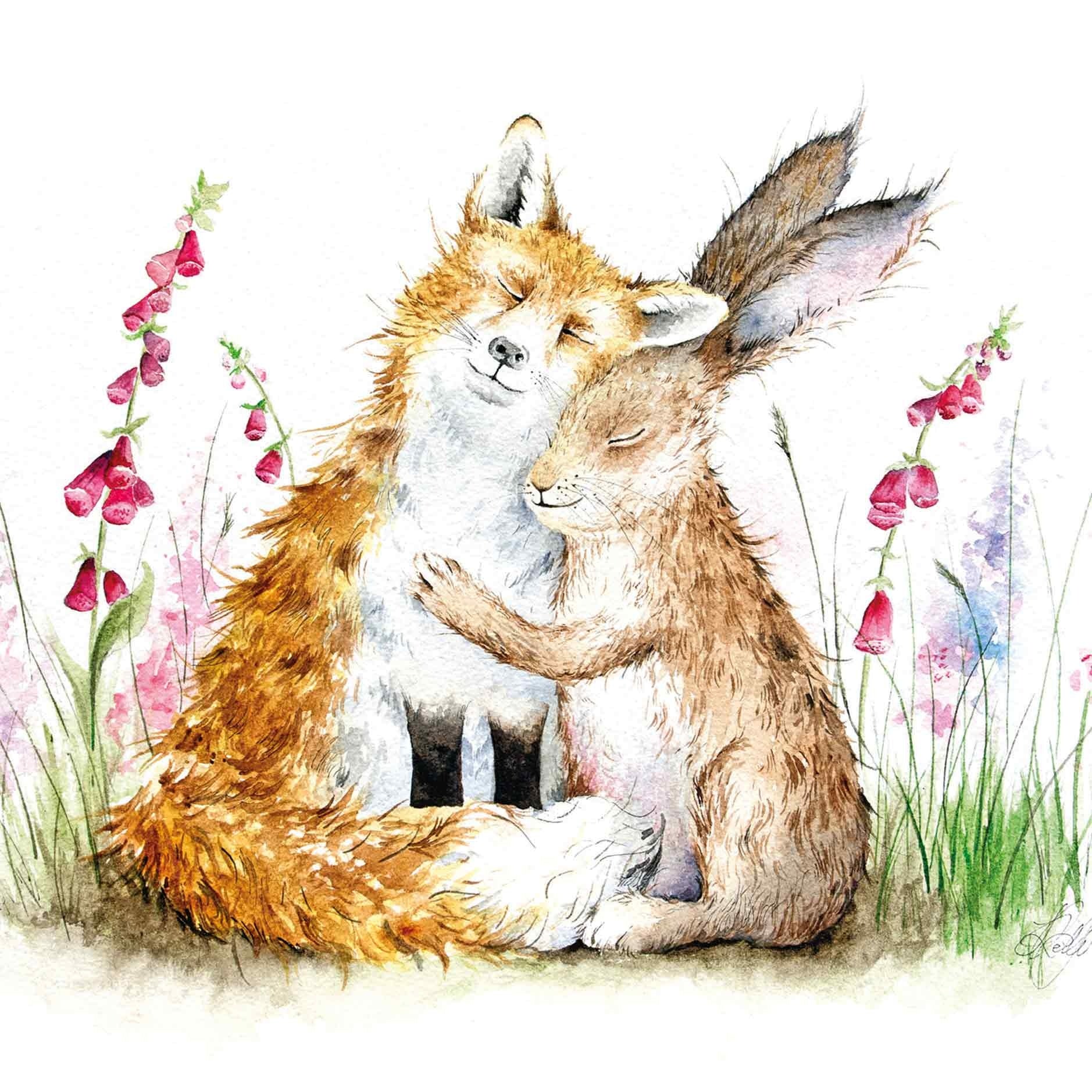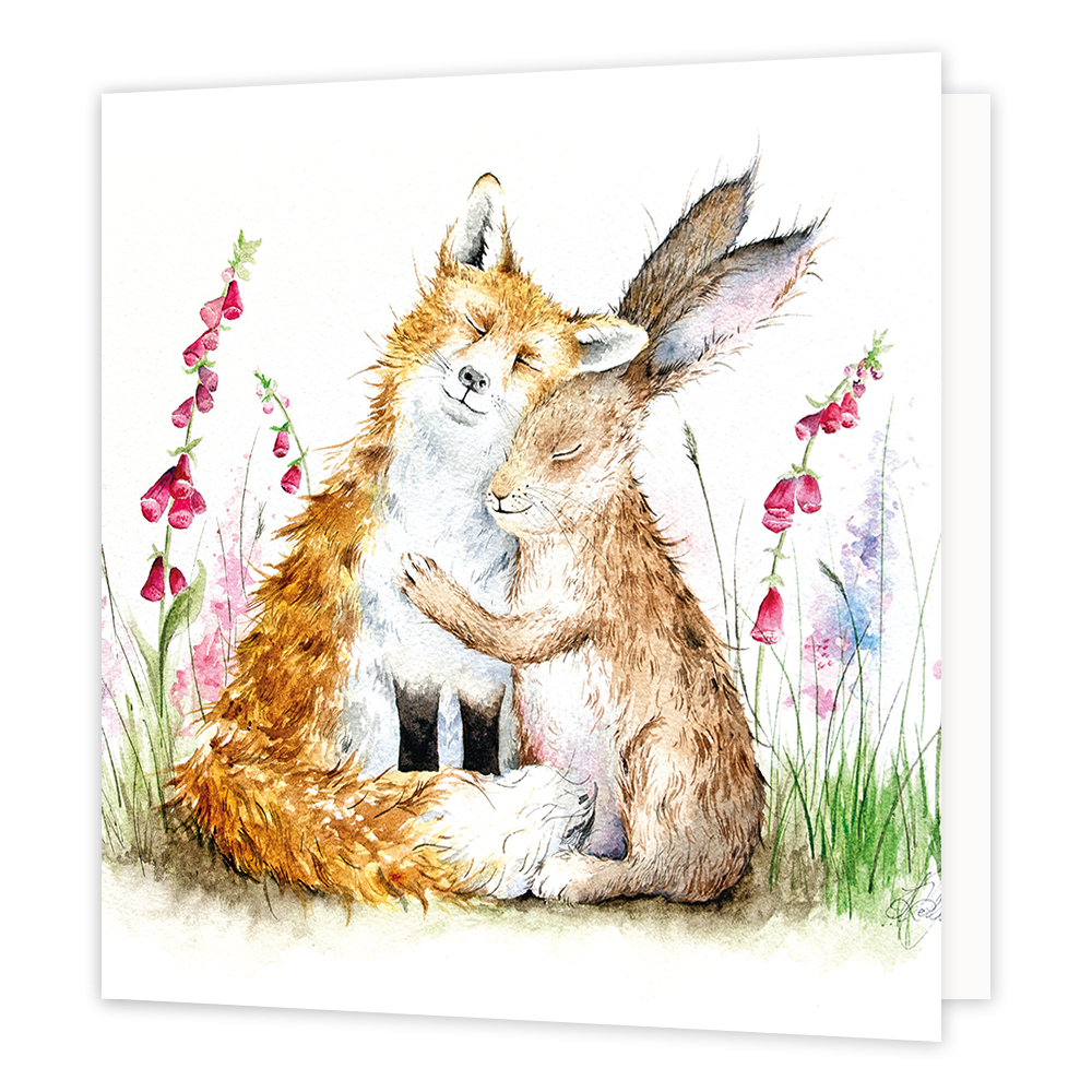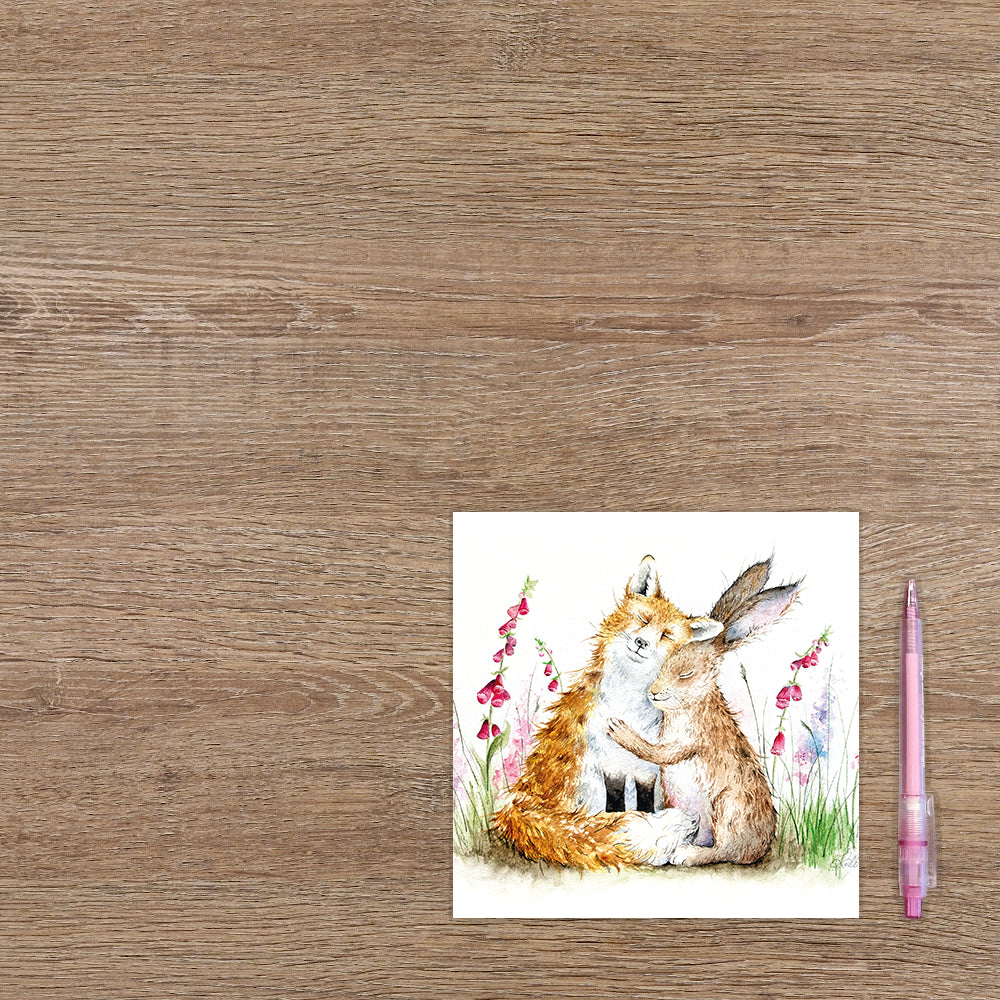 De wenskaart heeft een afmeting van x en een vierkante vorm. Op deze wenskaart staan een vos en een konijn die elkaar een knuffel geven. De binnenzijde van de wenskaart is blanco wat voldoende ruimte geeft om een persoonlijke boodschap te schrijven .