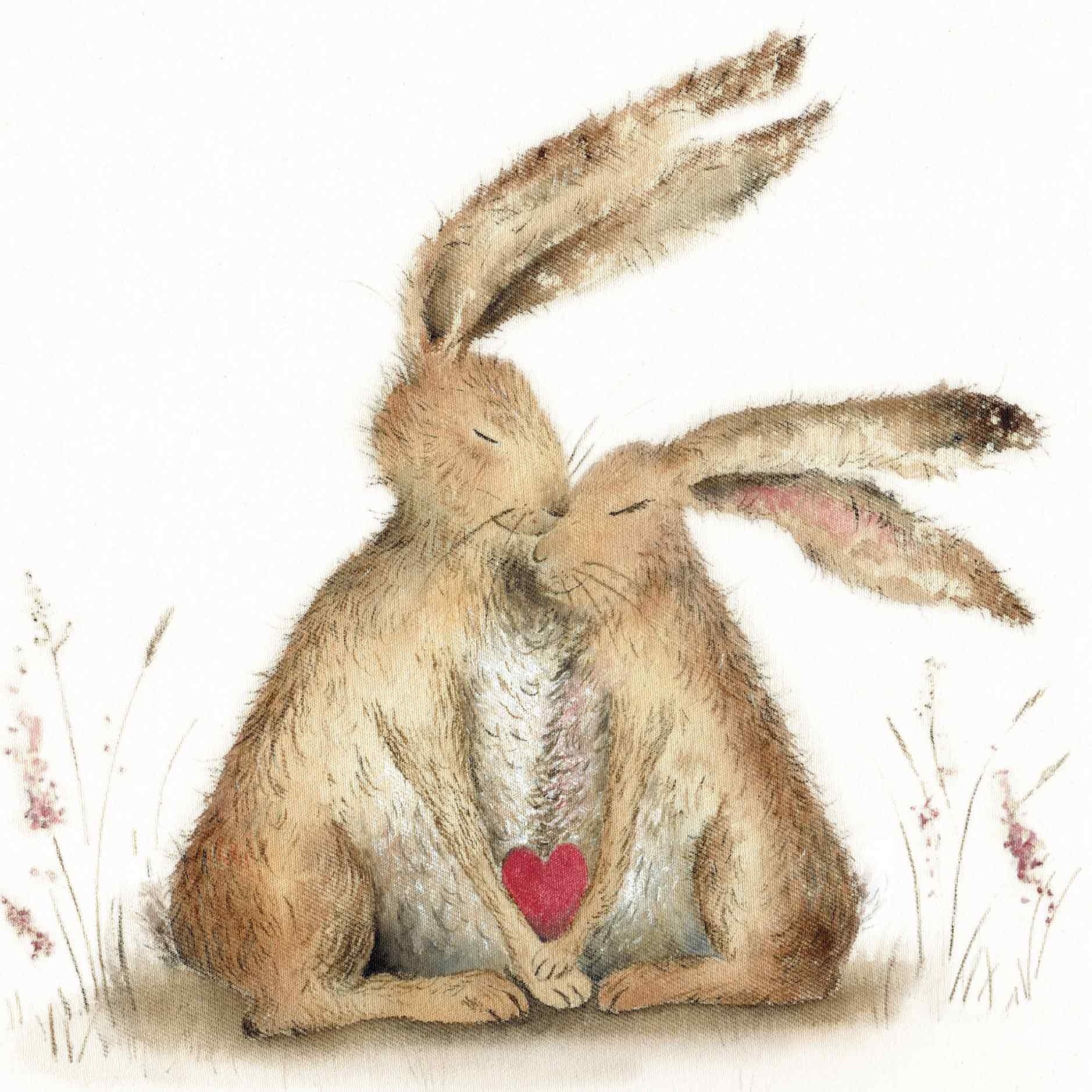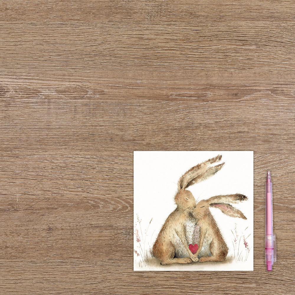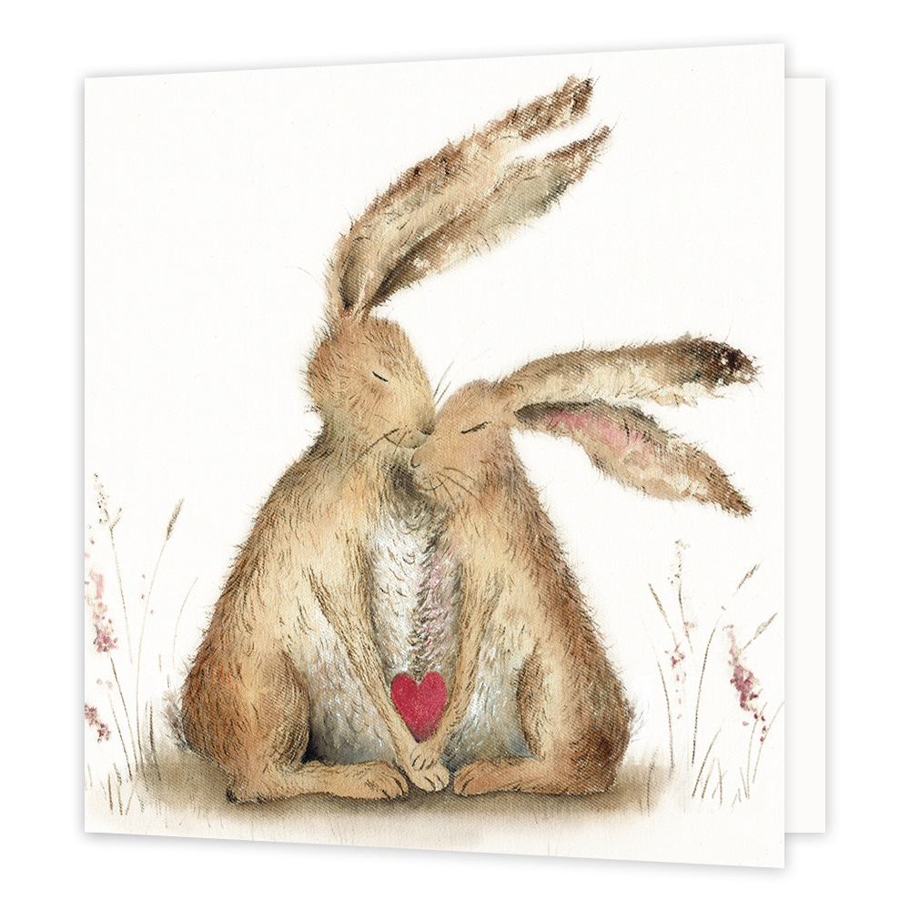 De wenskaart heeft een afmeting van x en een vierkante vorm. Op deze wenskaart staan twee konijnen die elkaar een knuffel geven. De binnenzijde van de wenskaart is blanco wat voldoende ruimte geeft om een persoonlijke boodschap te schrijven .