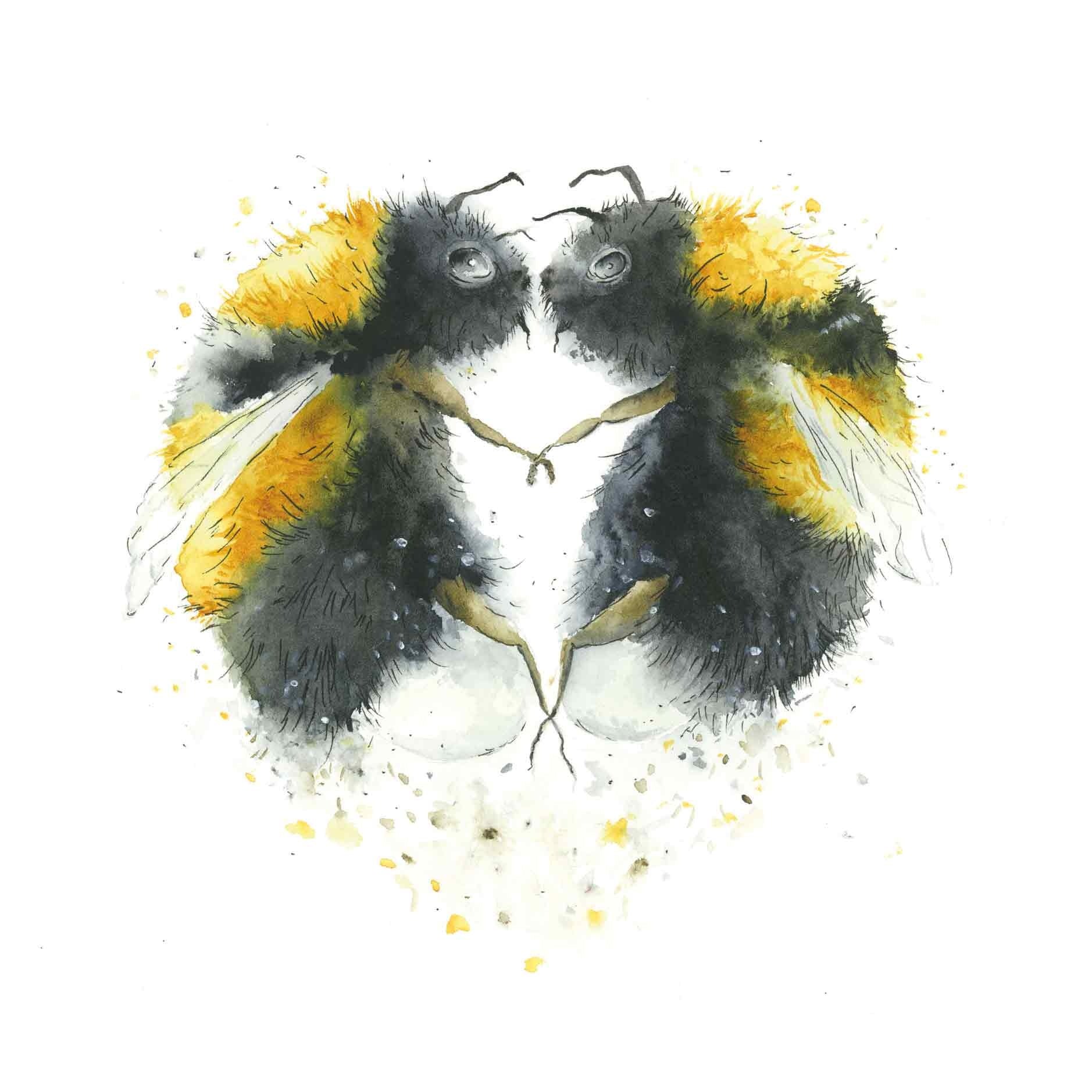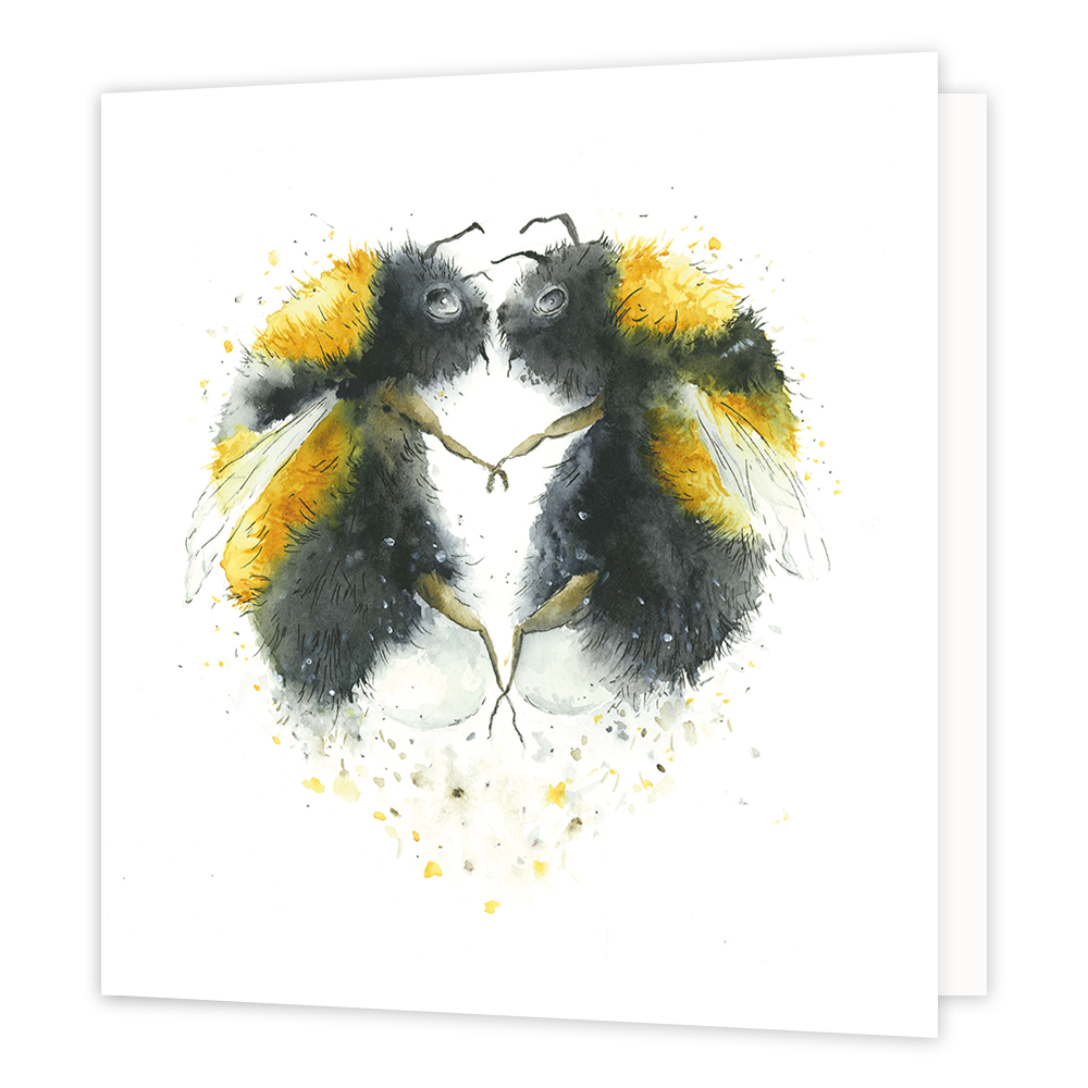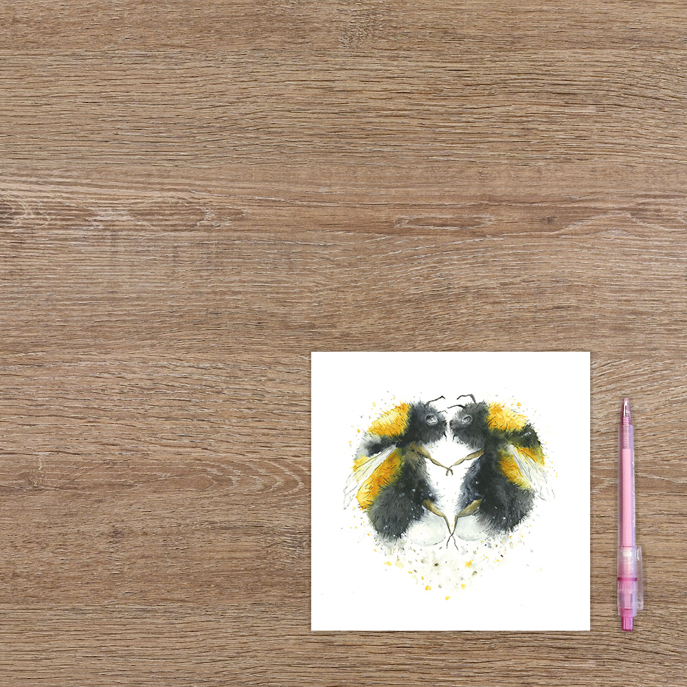De wenskaart heeft een afmeting van x en een vierkante vorm. Op deze wenskaart staan twee bijen die elkaar vasthouden en samen een hartje vormen. De binnenzijde van de wenskaart is blanco wat voldoende ruimte geeft om een persoonlijke boodschap te schrijven .