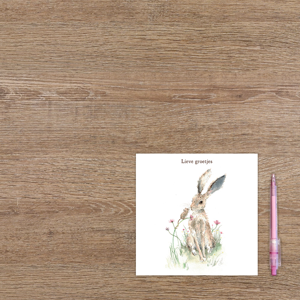 De wenskaart heeft een afmeting van x en een vierkante vorm. Op deze wenskaart staat een konijn en een muisje met daarboven de tekst: "Lieve groetjes". De binnenzijde van de wenskaart is blanco wat voldoende ruimte geeft om een persoonlijke boodschap te schrijven .