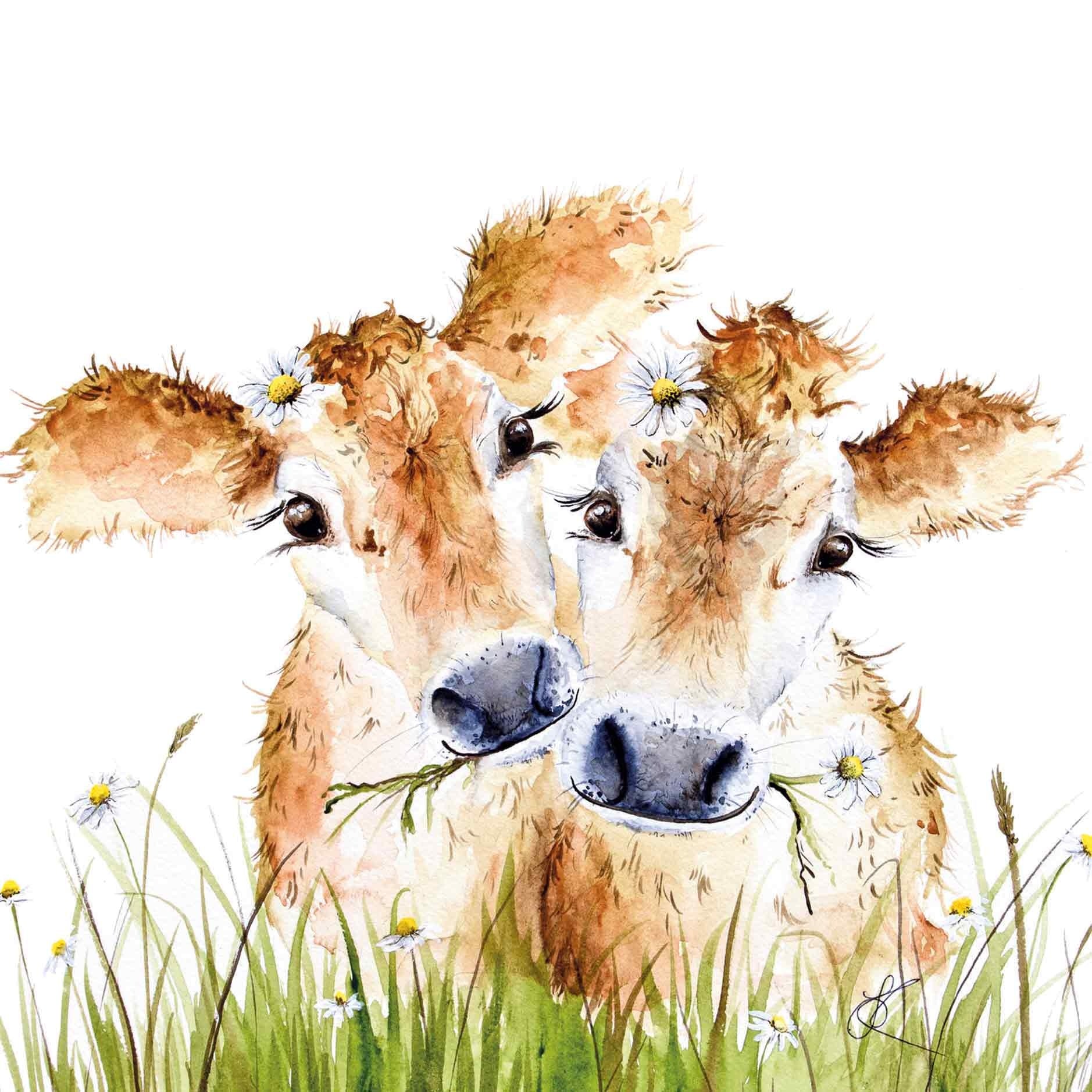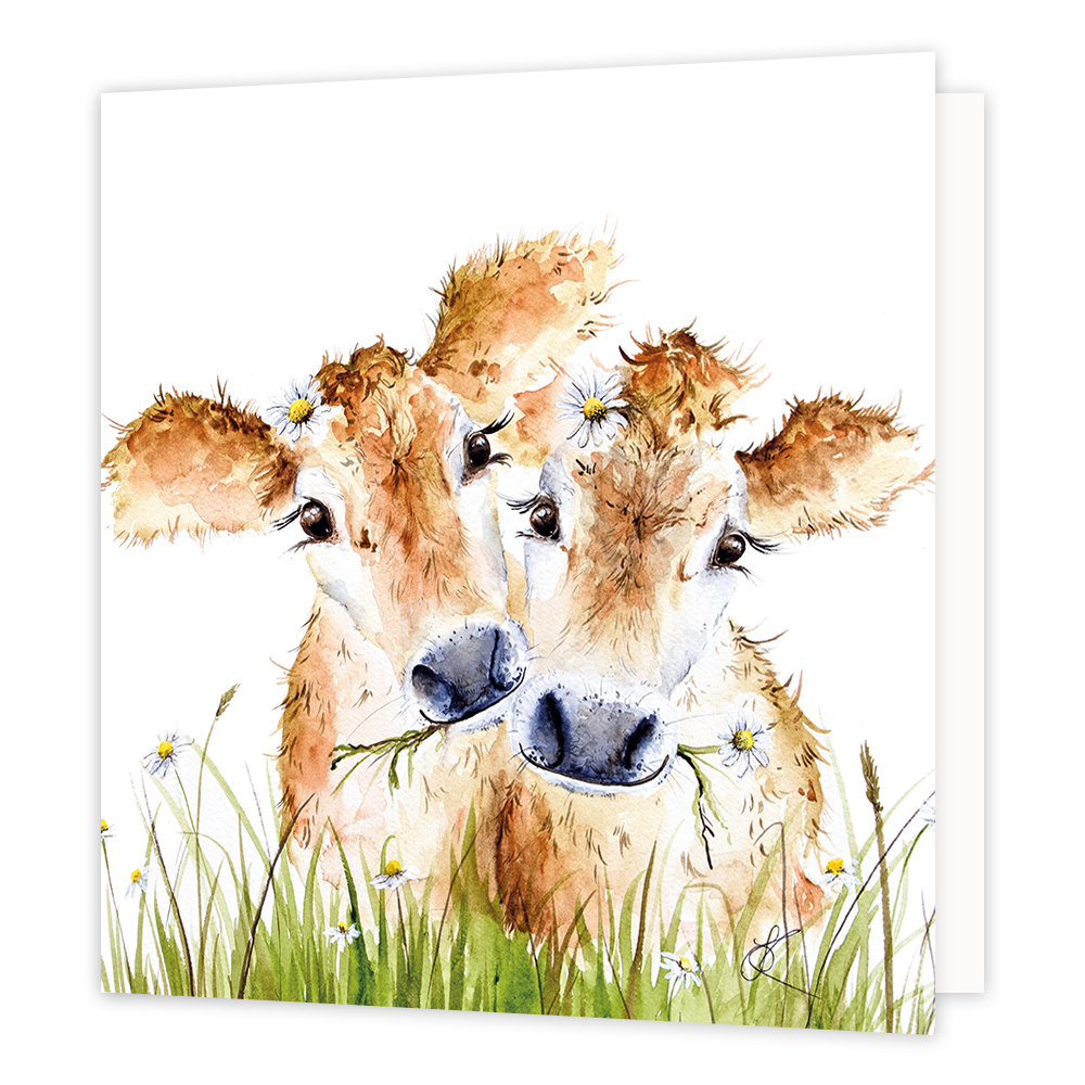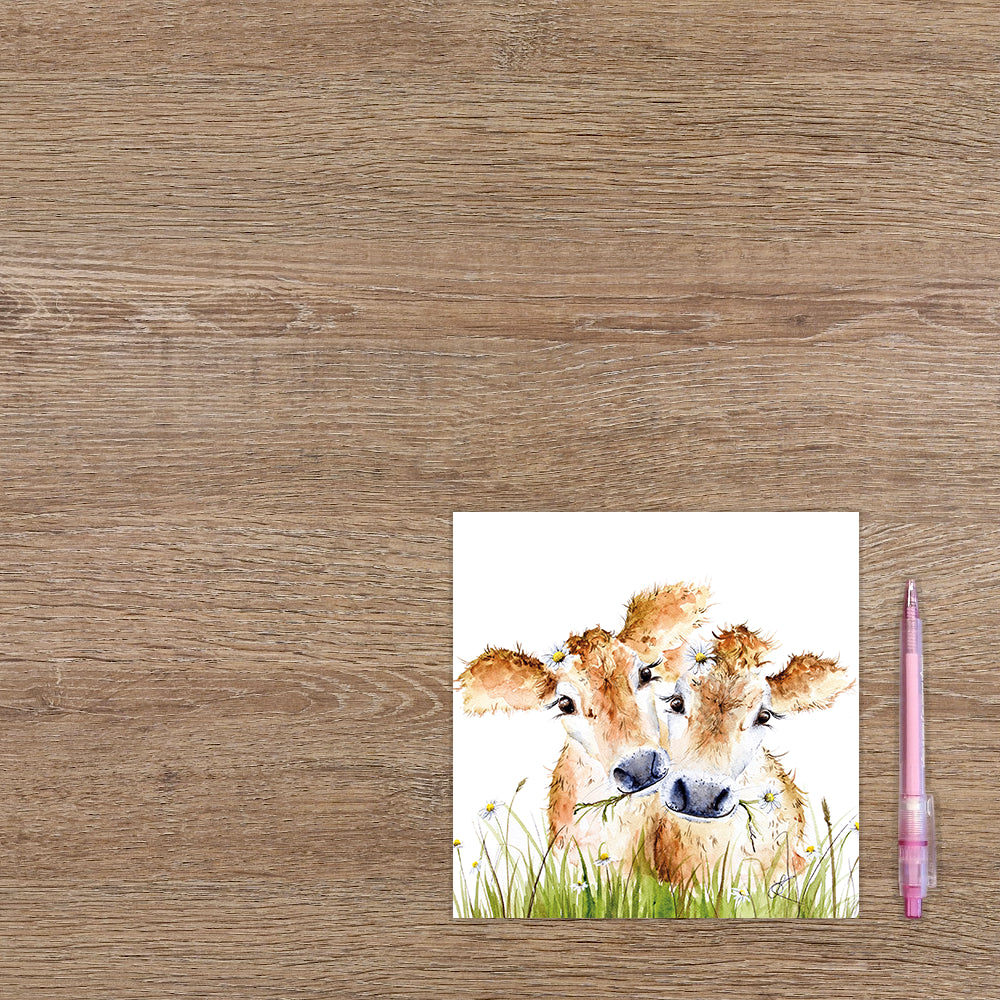 De wenskaart heeft een afmeting van x en een vierkante vorm. Op deze wenskaart staan twee kalfjes. De binnenzijde van de wenskaart is blanco wat voldoende ruimte geeft om een persoonlijke boodschap te schrijven .