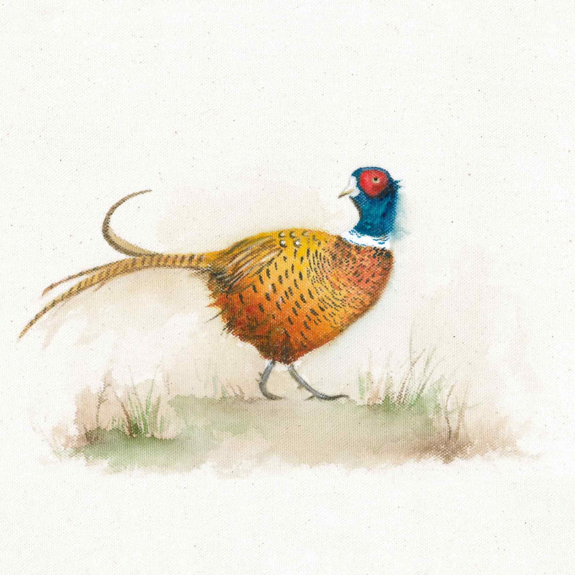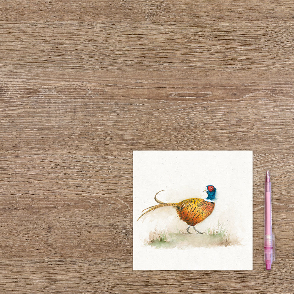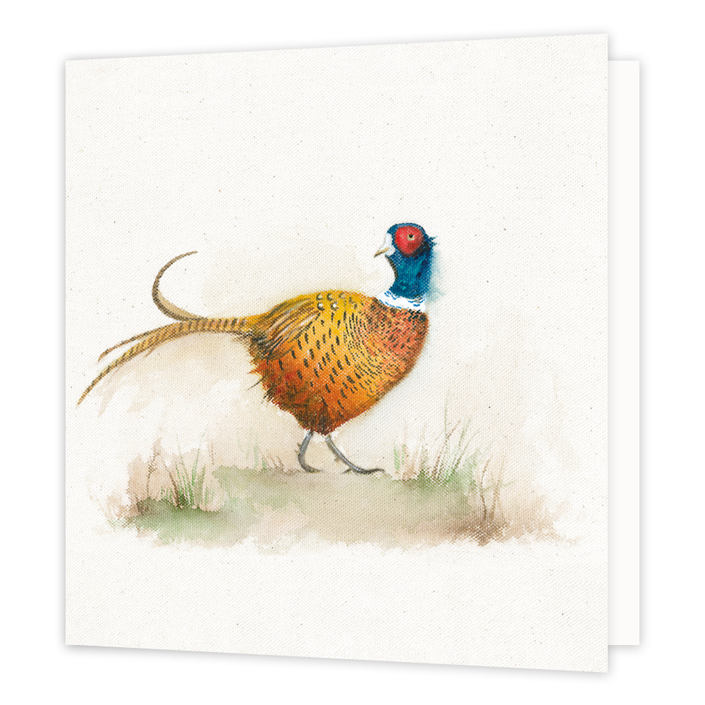De wenskaart heeft een afmeting van x en een vierkante vorm. Op deze wenskaart staat een fazant die door het gras loopt. De binnenzijde van de wenskaart is blanco wat voldoende ruimte geeft om een persoonlijke boodschap te schrijven .