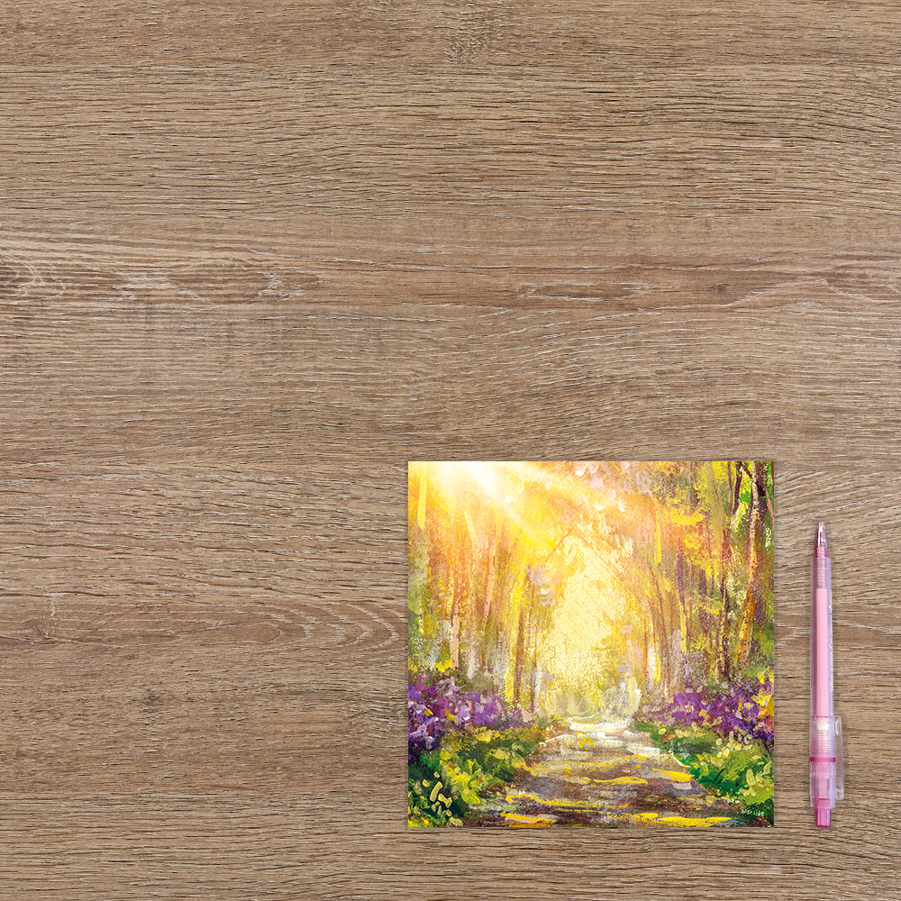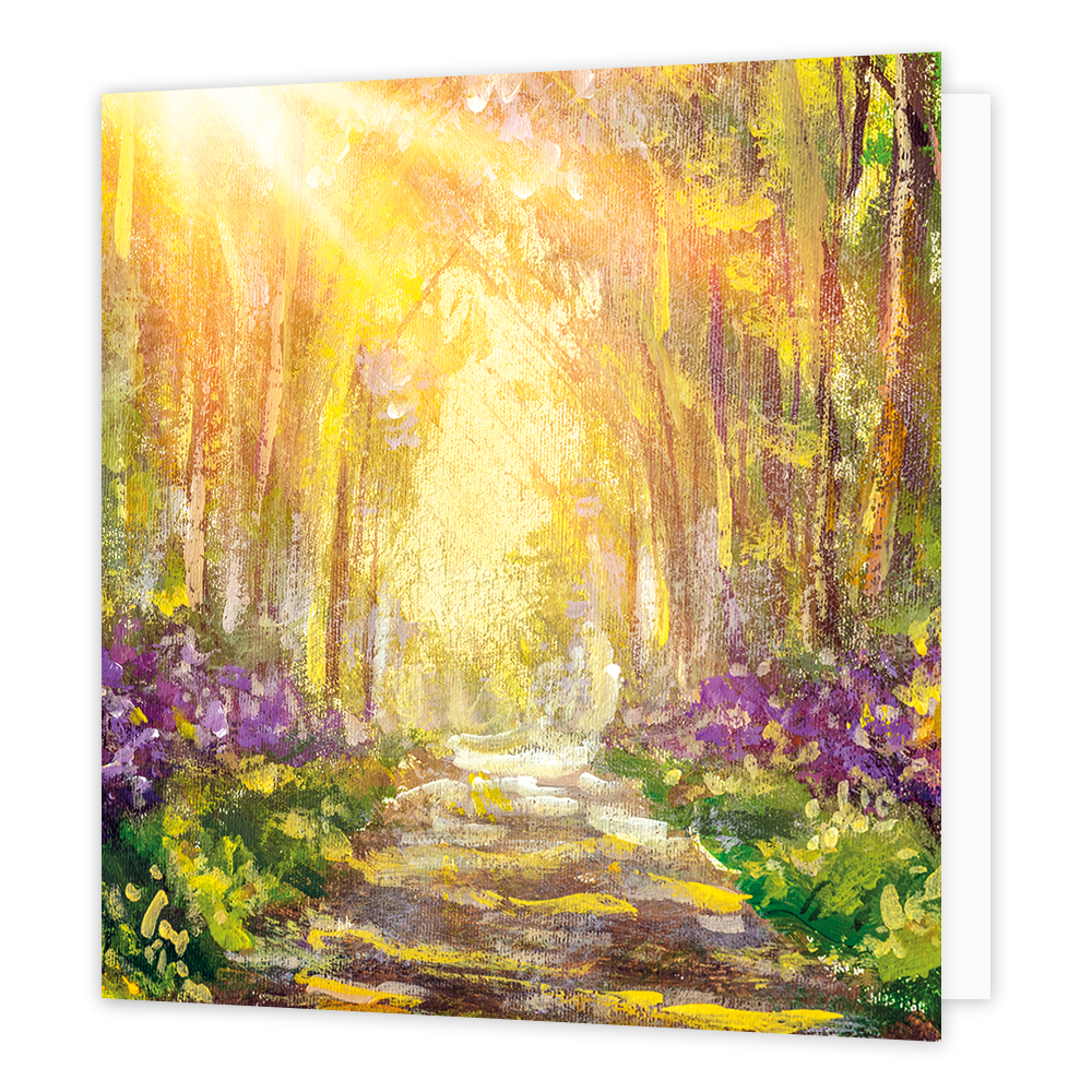 De wenskaart heeft een afmeting van x en een vierkante vorm. Op deze wenskaart staat een pad dat door een bos loopt. De binnenzijde van de wenskaart is blanco wat voldoende ruimte geeft om een persoonlijke boodschap te schrijven .