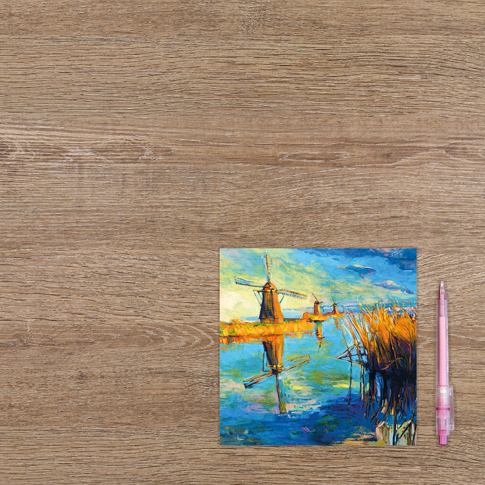 De wenskaart heeft een afmeting van x en een vierkante vorm. Op deze wenskaart staat een molen landschap met een rivier en drie molens. De binnenzijde van de wenskaart is blanco wat voldoende ruimte geeft om een persoonlijke boodschap te schrijven .