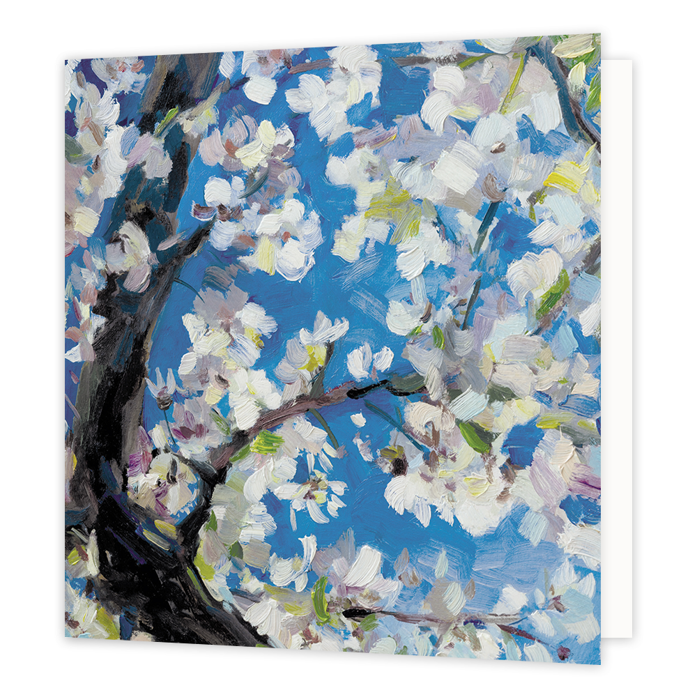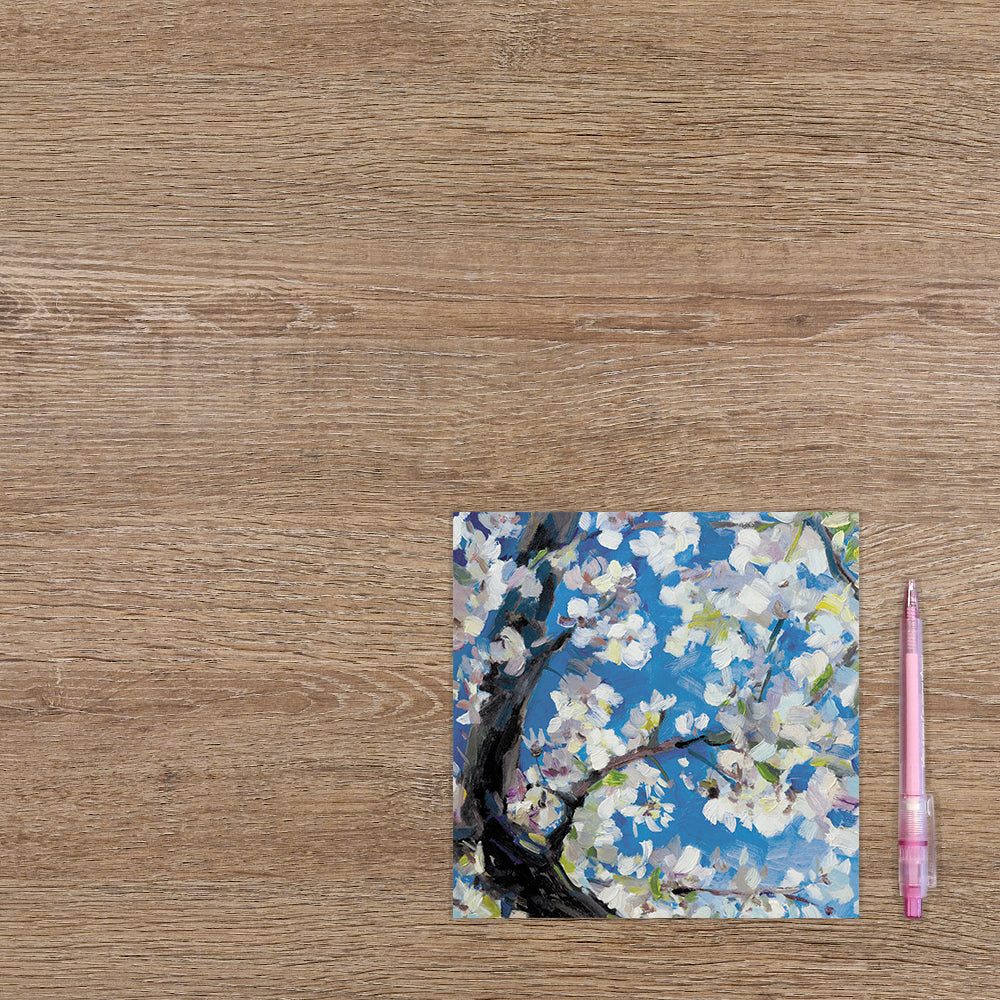 De wenskaart heeft een afmeting van x en een vierkante vorm. Op deze wenskaart staat een kersenbloesemboom met witte bladeren. De binnenzijde van de wenskaart is blanco wat voldoende ruimte geeft om een persoonlijke boodschap te schrijven .