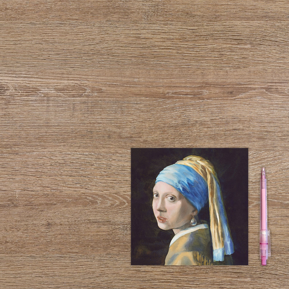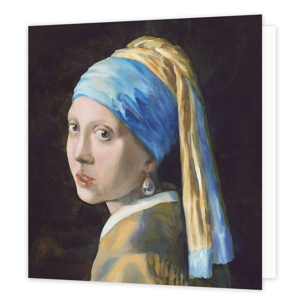 De wenskaart heeft een afmeting van x en een vierkante vorm. Op deze wenskaart staat het beroemde kunstwerk: "Meisje met de parel" van Johannes Vermeer. De binnenzijde van de wenskaart is blanco wat voldoende ruimte geeft om een persoonlijke boodschap te schrijven .
