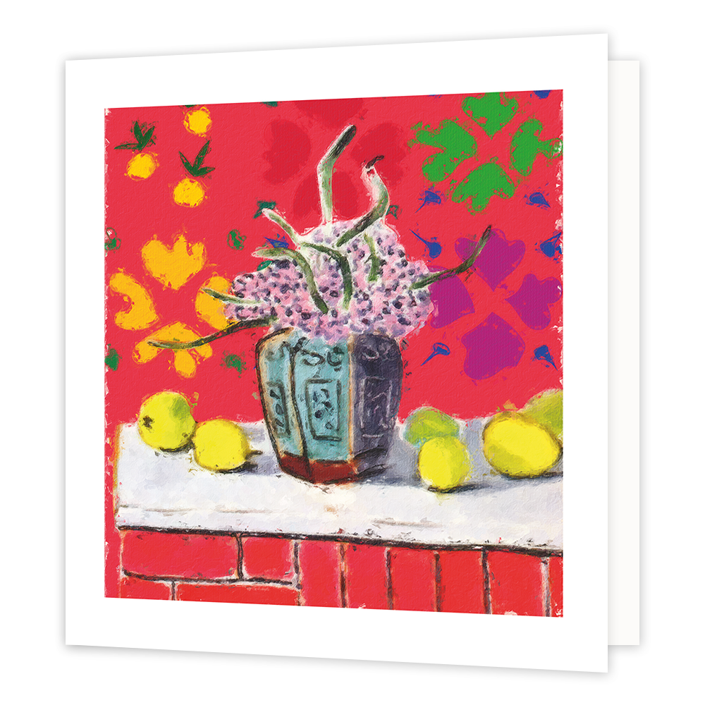 De wenskaart heeft een afmeting van x en een vierkante vorm. Op deze wenskaart staat een vaas met paarse bloemen en daarnaast gele citroenen. De binnenzijde van de wenskaart is blanco wat voldoende ruimte geeft om een persoonlijke boodschap te schrijven .