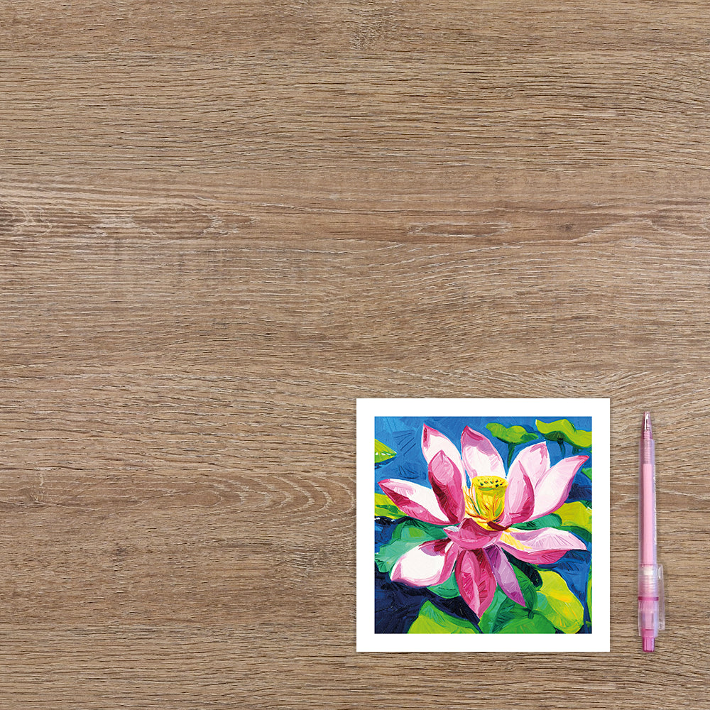 De wenskaart heeft een afmeting van x en een vierkante vorm. Op deze wenskaart staat een roze waterlelie. De binnenzijde van de wenskaart is blanco wat voldoende ruimte geeft om een persoonlijke boodschap te schrijven .