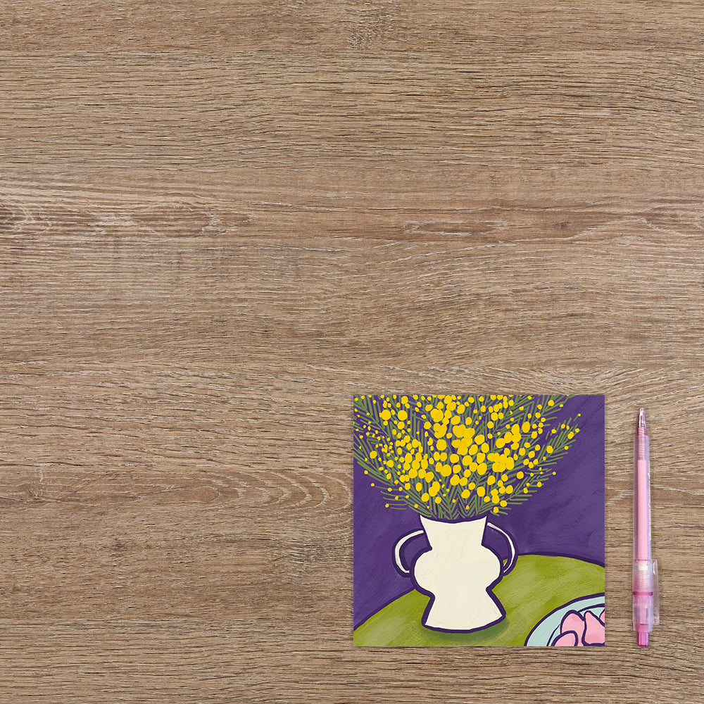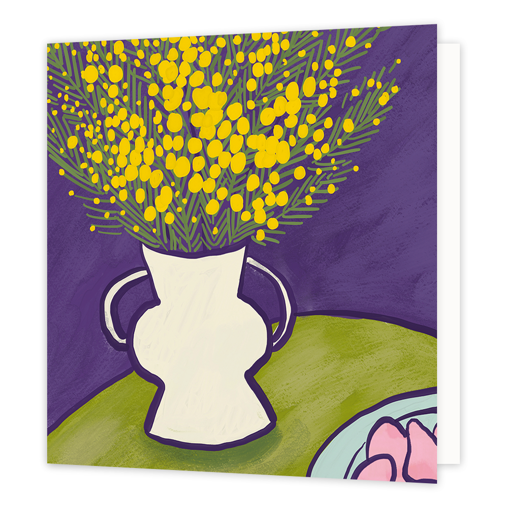 De wenskaart heeft een afmeting van x en een vierkante vorm. Op deze wenskaart staat een witte vaas met gele bloemen, op een tafel. De binnenzijde van de wenskaart is blanco wat voldoende ruimte geeft om een persoonlijke boodschap te schrijven .