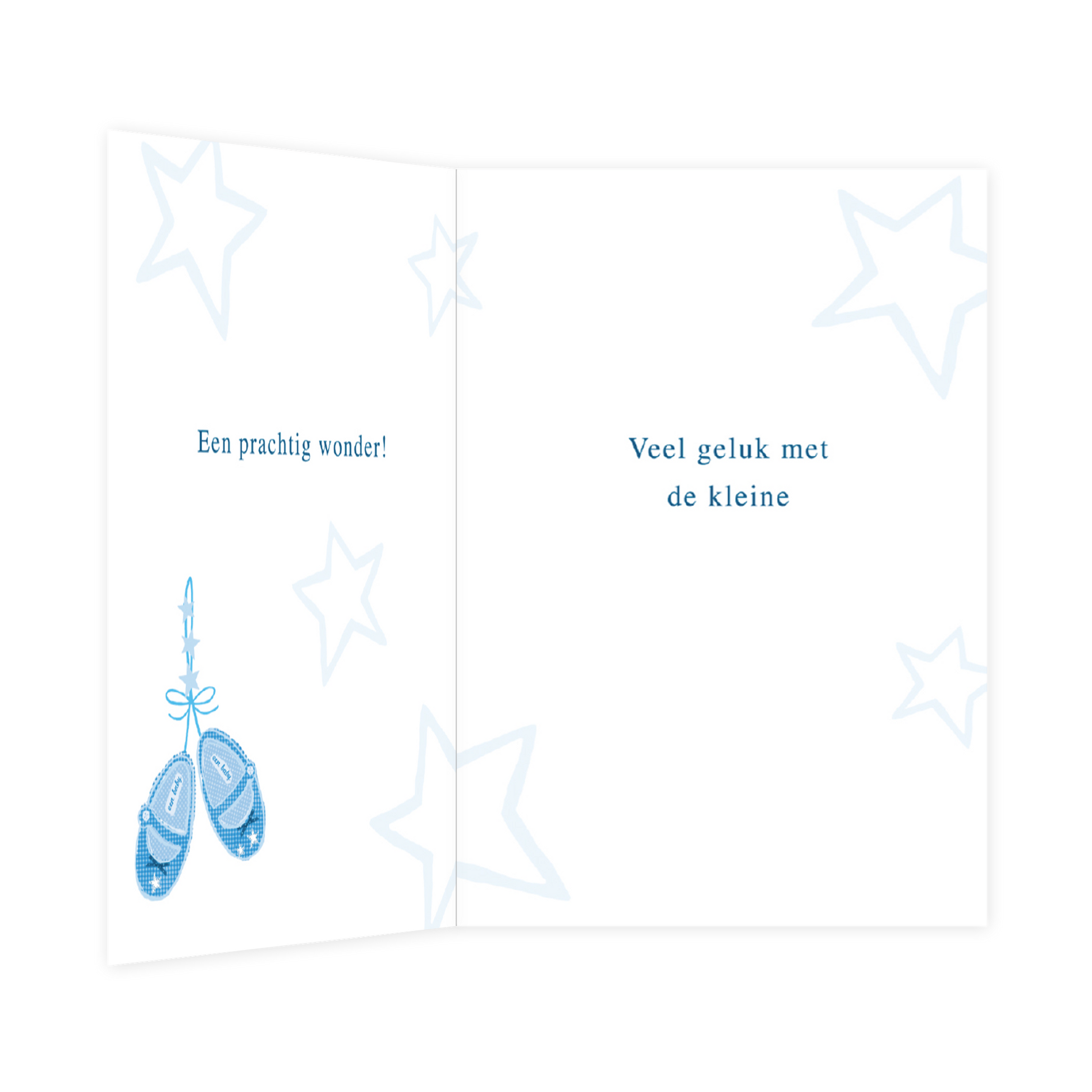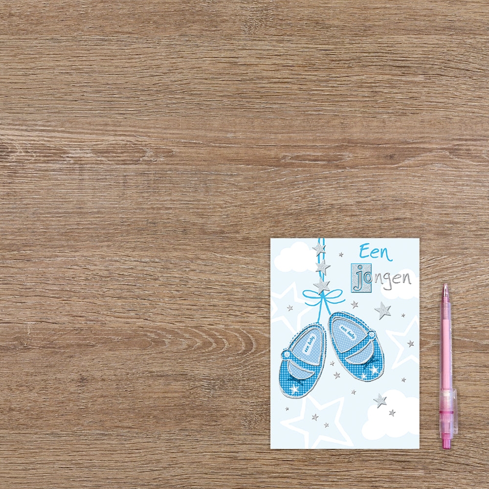 De wenskaart heeft een afmeting van x en een staande vorm. Op deze wenskaart zijn blauwe babyschoentjes te zien op een lichtblauwe achtergrond waar witte sterren en wolken te zien zijn. Rechts bovenaan staat de tekst: "Een jongen". De binnenzijde van de wenskaart is bedrukt met een ontwerp passend bij de voorzijde van de kaart en de tekst "Veel geluk met de kleine".