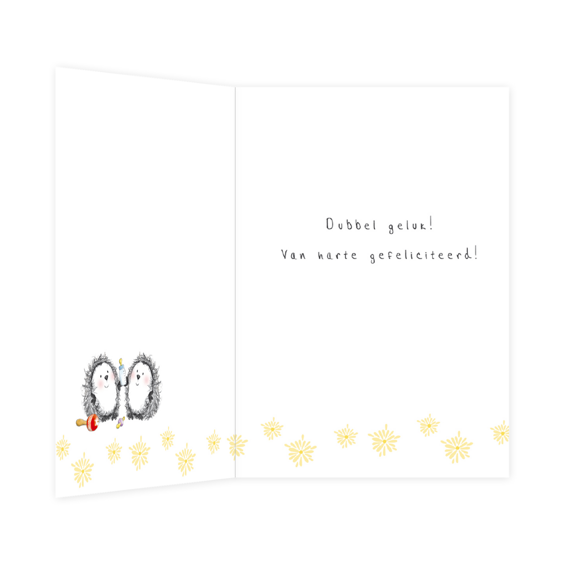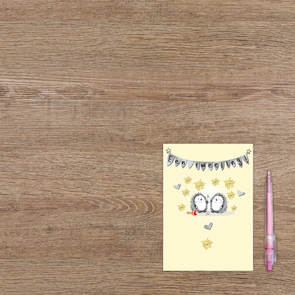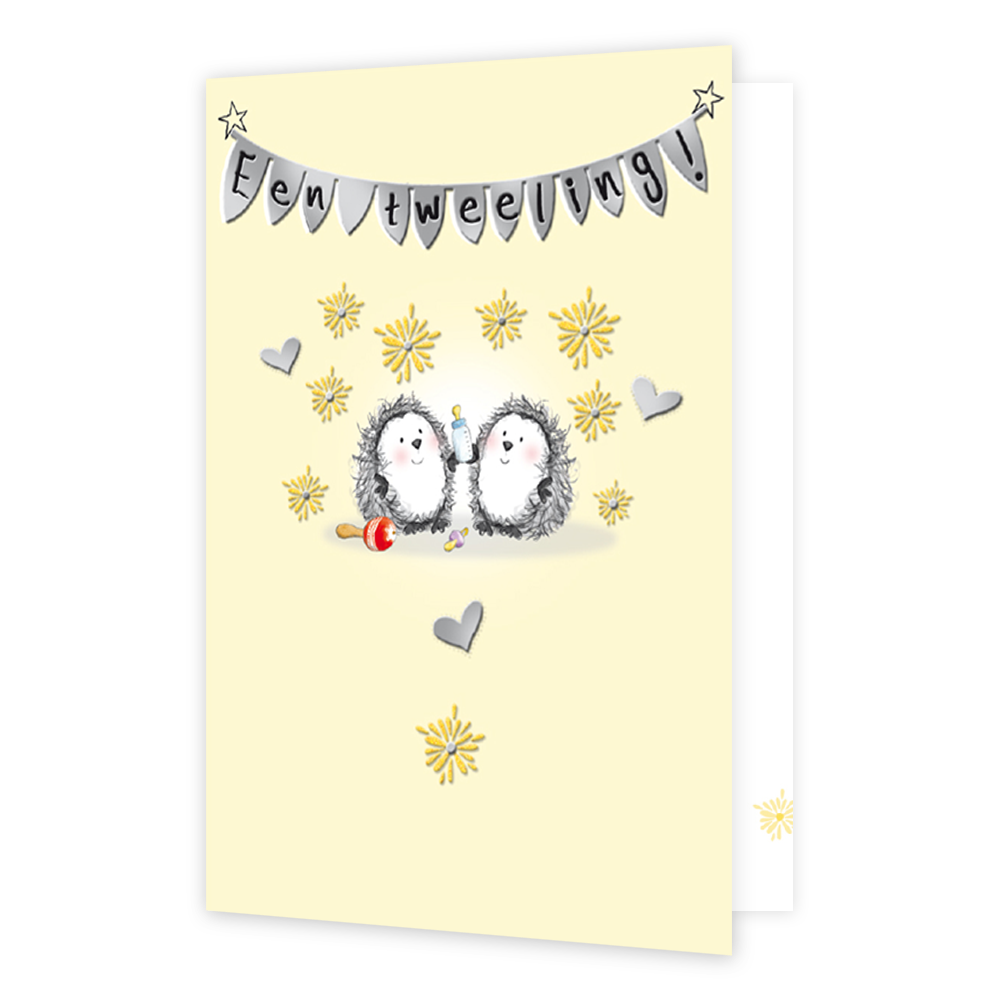 De wenskaart heeft een afmeting van x en een staande vorm. Op deze wenskaart staan twee egeltjes die een babyflesje vast hebben. Daarboven hangt een slinger met de tekst: "Een tweeling!". De binnenzijde van de wenskaart is bedrukt met een ontwerp passend bij de voorzijde van de kaart en de tekst "Dubbel geluk! Van harte gefeliciteerd!".