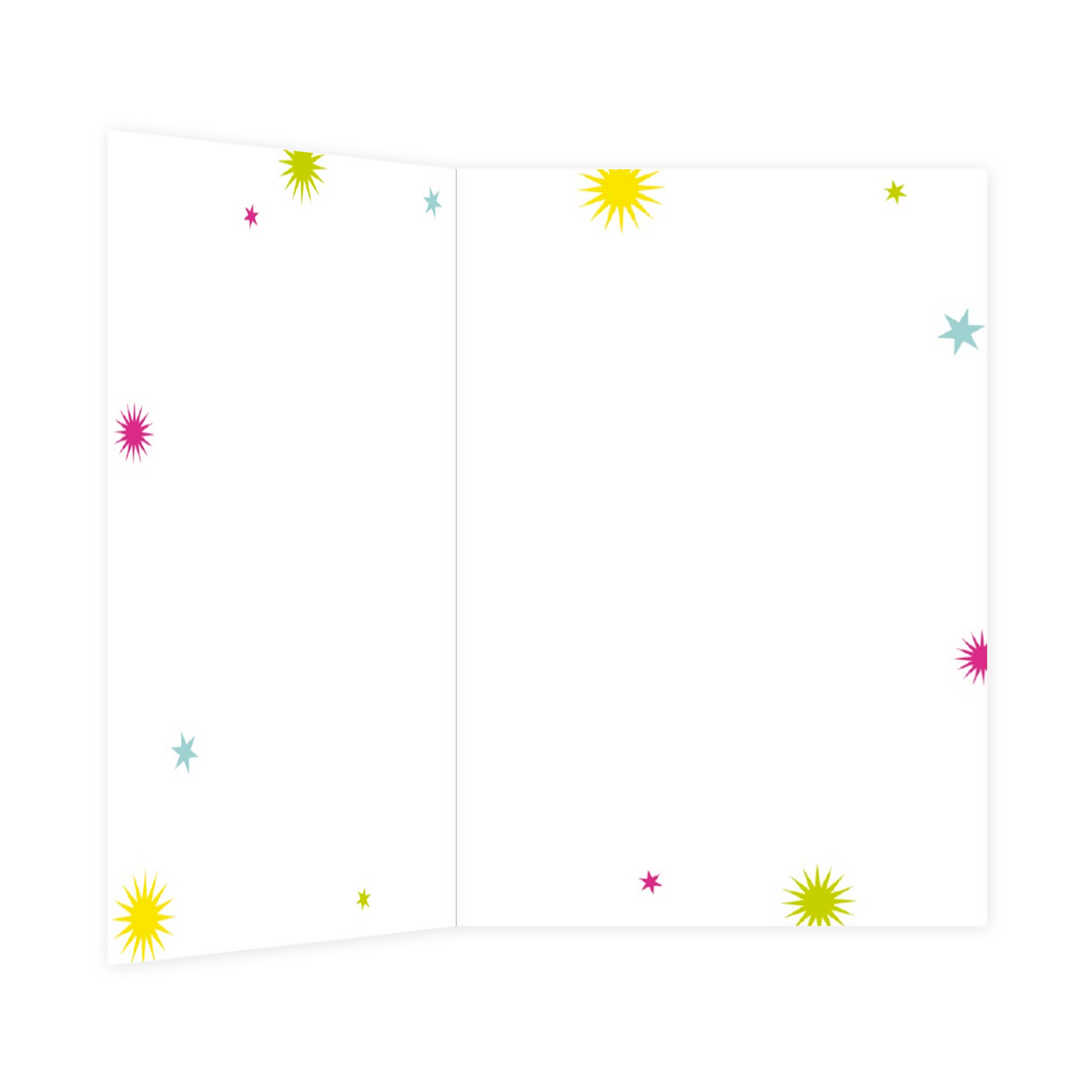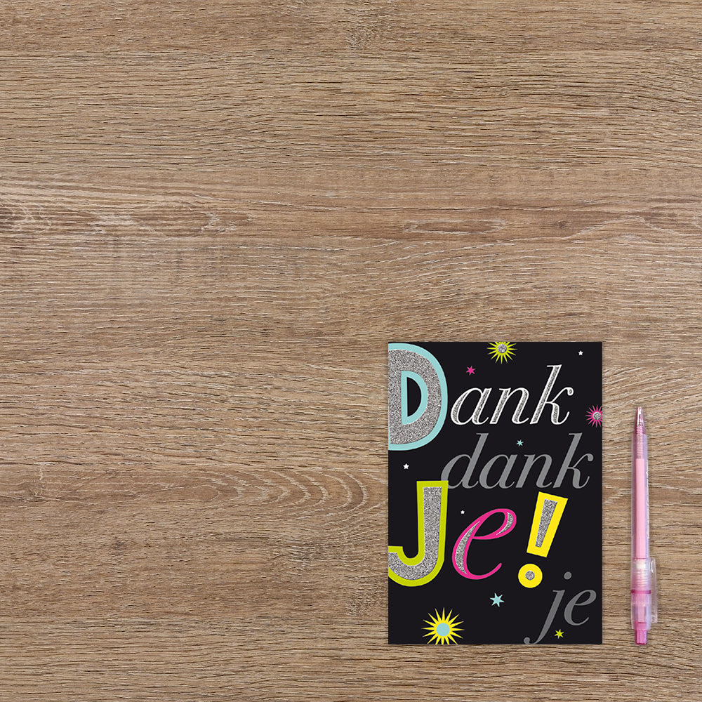 De wenskaart heeft een afmeting van x en een staande vorm. Op deze wenskaart staan sterren in de kleuren geel en roze op een zwarte achtergrond. Over de gehele wenskaart staat de tekst: "Dank dank je! je". De binnenzijde van de wenskaart is bedrukt met een ontwerp passend bij de voorzijde van de kaart .