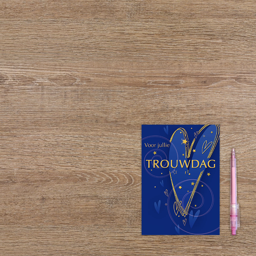 De wenskaart heeft een afmeting van x en een staande vorm. Op deze wenskaart is een hart te zien met gouden randen, op een donkerblauwe achtergrond. In het midden staat de tekst: "Voor jullie trouwdag". De binnenzijde van de wenskaart is bedrukt met een ontwerp passend bij de voorzijde van de kaart en de tekst "Van harte gefeliciteerd".