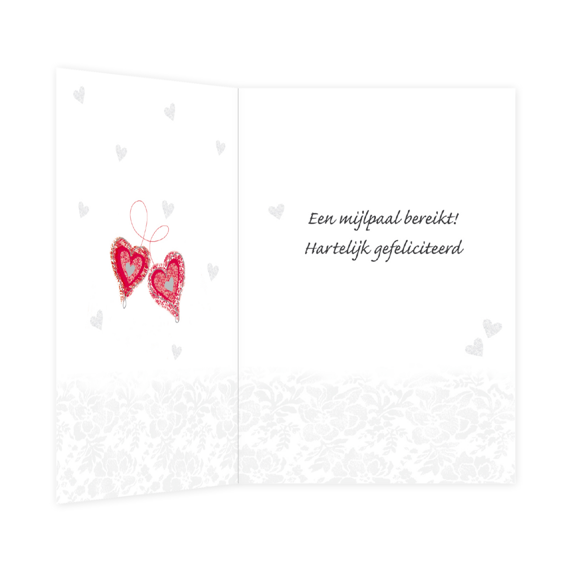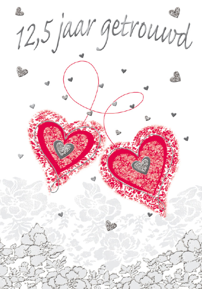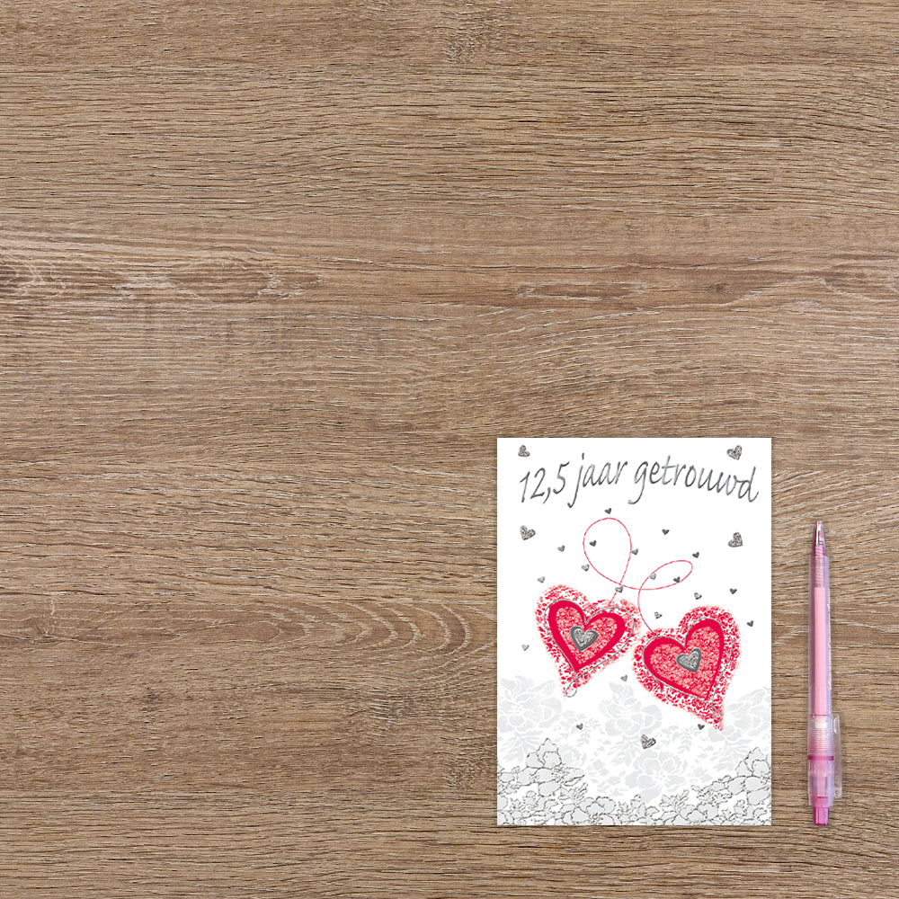 De wenskaart heeft een afmeting van x en een staande vorm. Op deze wenskaart staan twee rode hartjes die met een rode lijn met elkaar zijn verbonden. Bovenaan staat de tekst: "12,5 jaar getrouwd". De binnenzijde van de wenskaart is bedrukt met een ontwerp passend bij de voorzijde van de kaart en de tekst "Een mijlpaal bereikt! Hartelijk gefeliciteerd".
