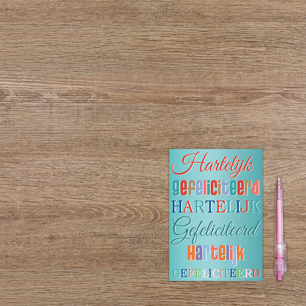 De wenskaart heeft een afmeting van x en een staande vorm. Op deze wenskaart staat drie keer de tekst: "Hartelijk gefeliciteerd" op een licht blauwe achtergrond". De binnenzijde van de wenskaart is blanco wat voldoende ruimte geeft om een persoonlijke boodschap te schrijven .