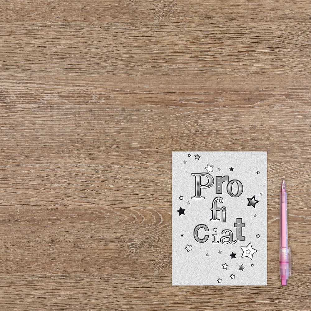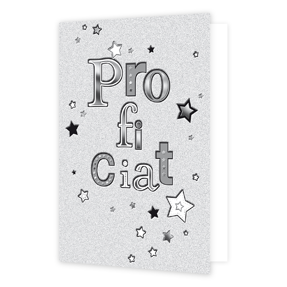 De wenskaart heeft een afmeting van x en een staande vorm. Op deze wenskaart staan sterren in het wit, zwart en diverse kleuren grijs. In het midden staat de tekst: 'Proficiat". De binnenzijde van de wenskaart is bedrukt met een ontwerp passend bij de voorzijde van de kaart en de tekst "Goed gedaan!".