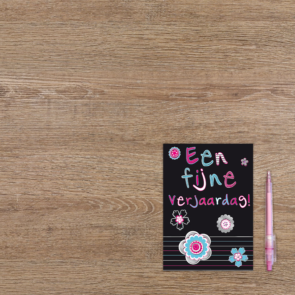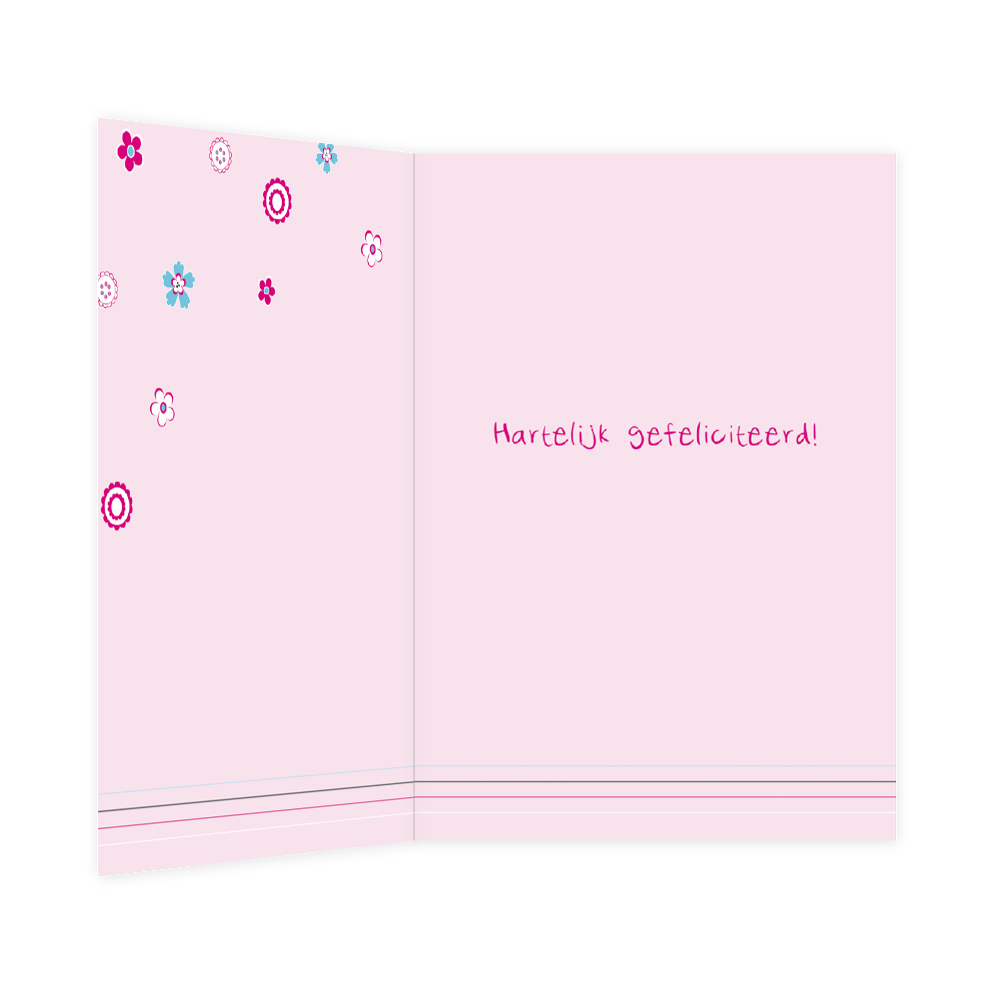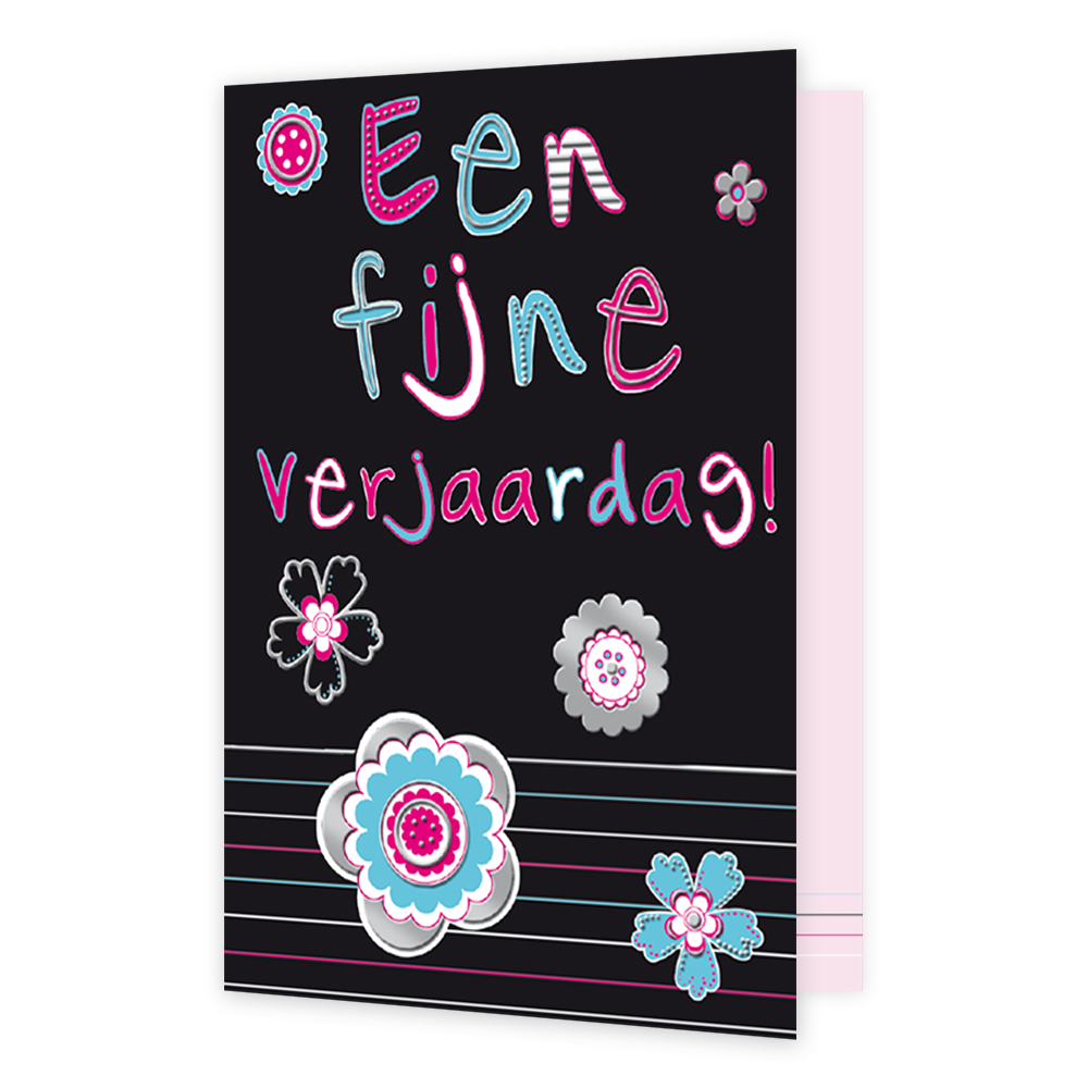 De wenskaart heeft een afmeting van x en een staande vorm. Op deze wenskaart staan bloemen in de kleuren roze, blauw, wit en grijs,op een zwarte achtergrond. Bovenaan staat de tekst: "Een fijne verjaardag!". De binnenzijde van de wenskaart is bedrukt met een ontwerp passend bij de voorzijde van de kaart en de tekst "Hartelijk gefeliciteerd!".