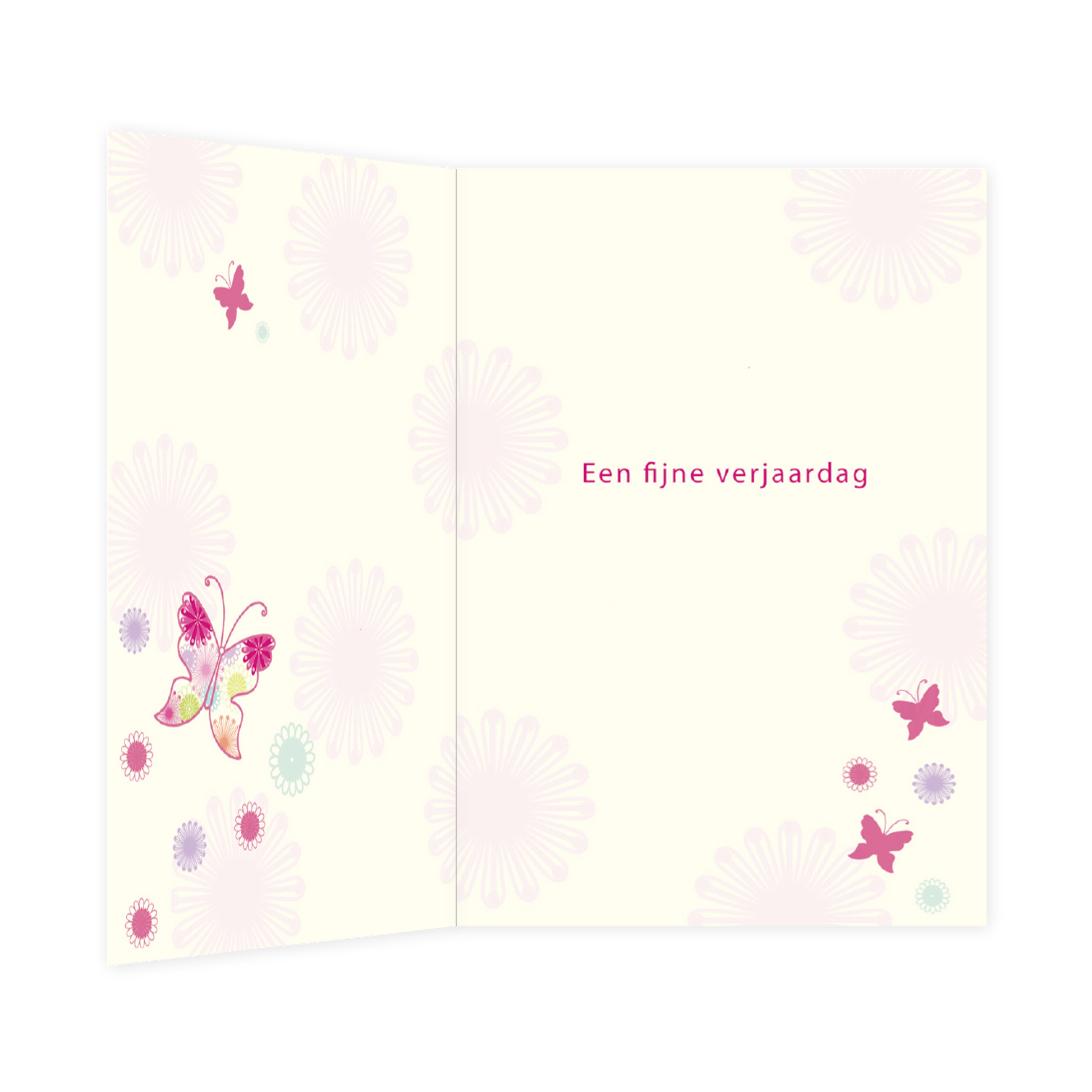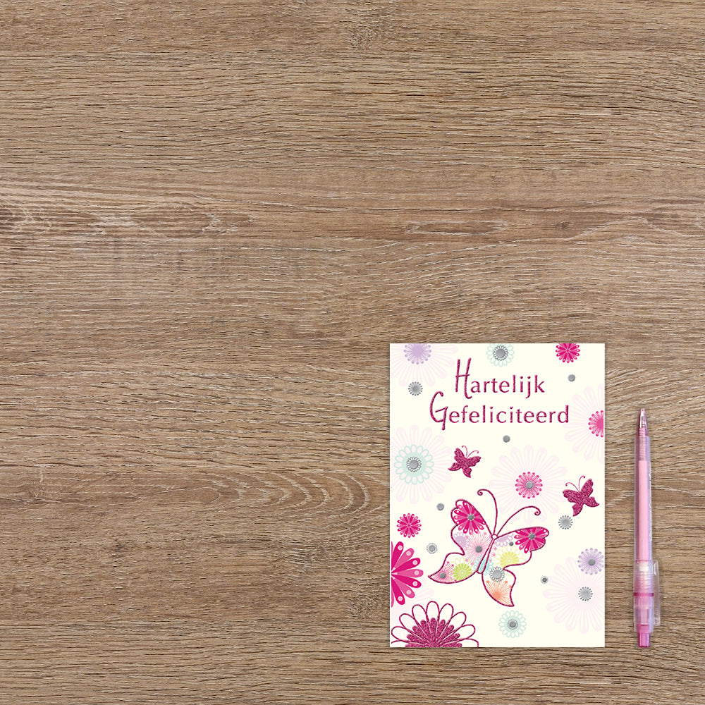 De wenskaart heeft een afmeting van x en een staande vorm. Op deze wenskaart staan bloemen en vlinders in de kleuren roze, oranje, blauw en paars. Bovenaan staat de tekst: "Hartelijk gefeliciteerd". De binnenzijde van de wenskaart is bedrukt met een ontwerp passend bij de voorzijde van de kaart en de tekst "Een fijne verjaardag".