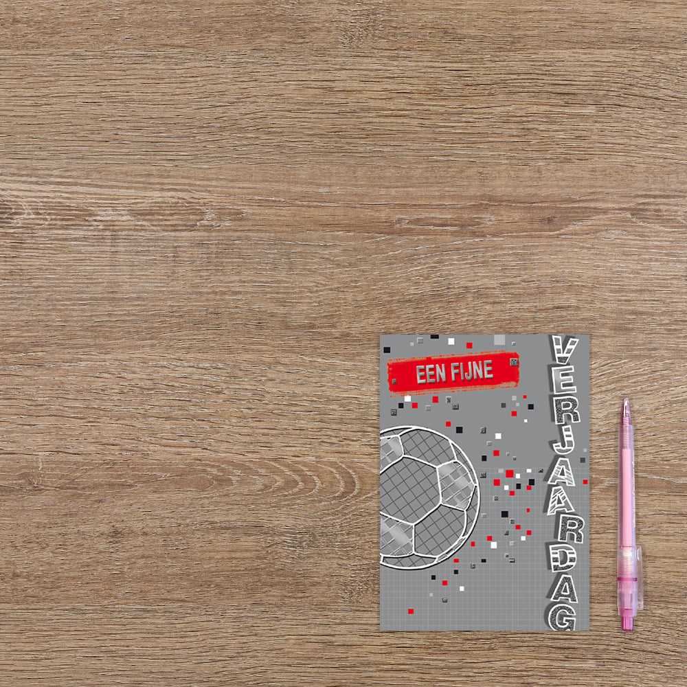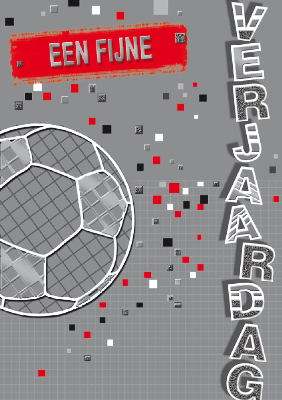 De wenskaart heeft een afmeting van x en een staande vorm. Op deze wenskaart staan blokjes in de kleuren grijs, rood, wit en zwart, waarbij aan de linkerkant een voetbal gevormd wordt. Op de kaart staat de tekst: 'Een fijne verjaardag". De binnenzijde van de wenskaart is bedrukt met een ontwerp passend bij de voorzijde van de kaart en de tekst "Van harte gefeliciteerd!".