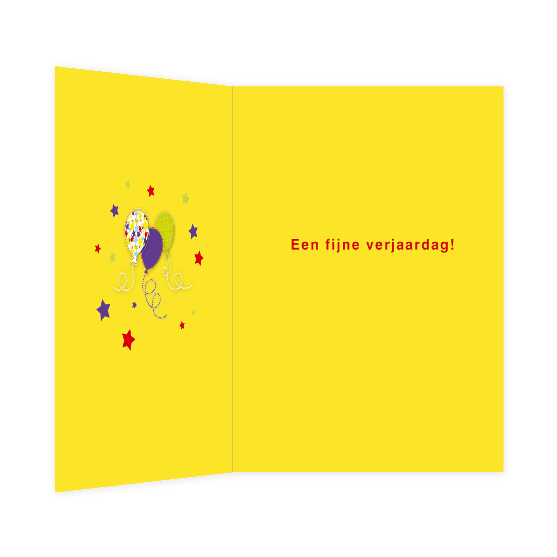 De wenskaart heeft een afmeting van x en een staande vorm. Op deze wenskaart staan ballonnen met daarop sterren en stippen in de kleuren wit, blauw, geel, rood en paars, op een rode achtergrond. Bovenaan staat de tekst: 'Hartelijk gefeliciteerd". De binnenzijde van de wenskaart is bedrukt met een ontwerp passend bij de voorzijde van de kaart en de tekst "Een fijne verjaardag".