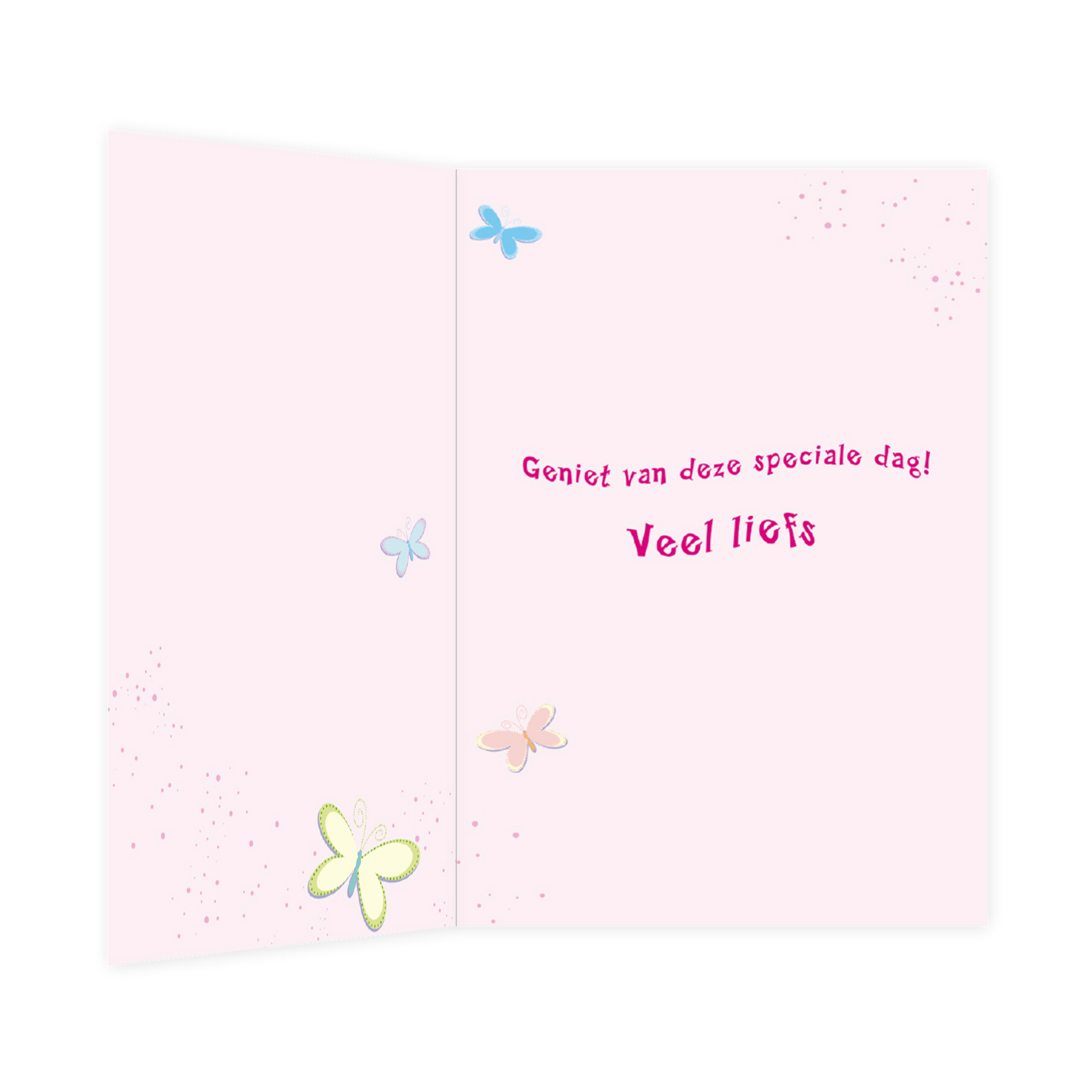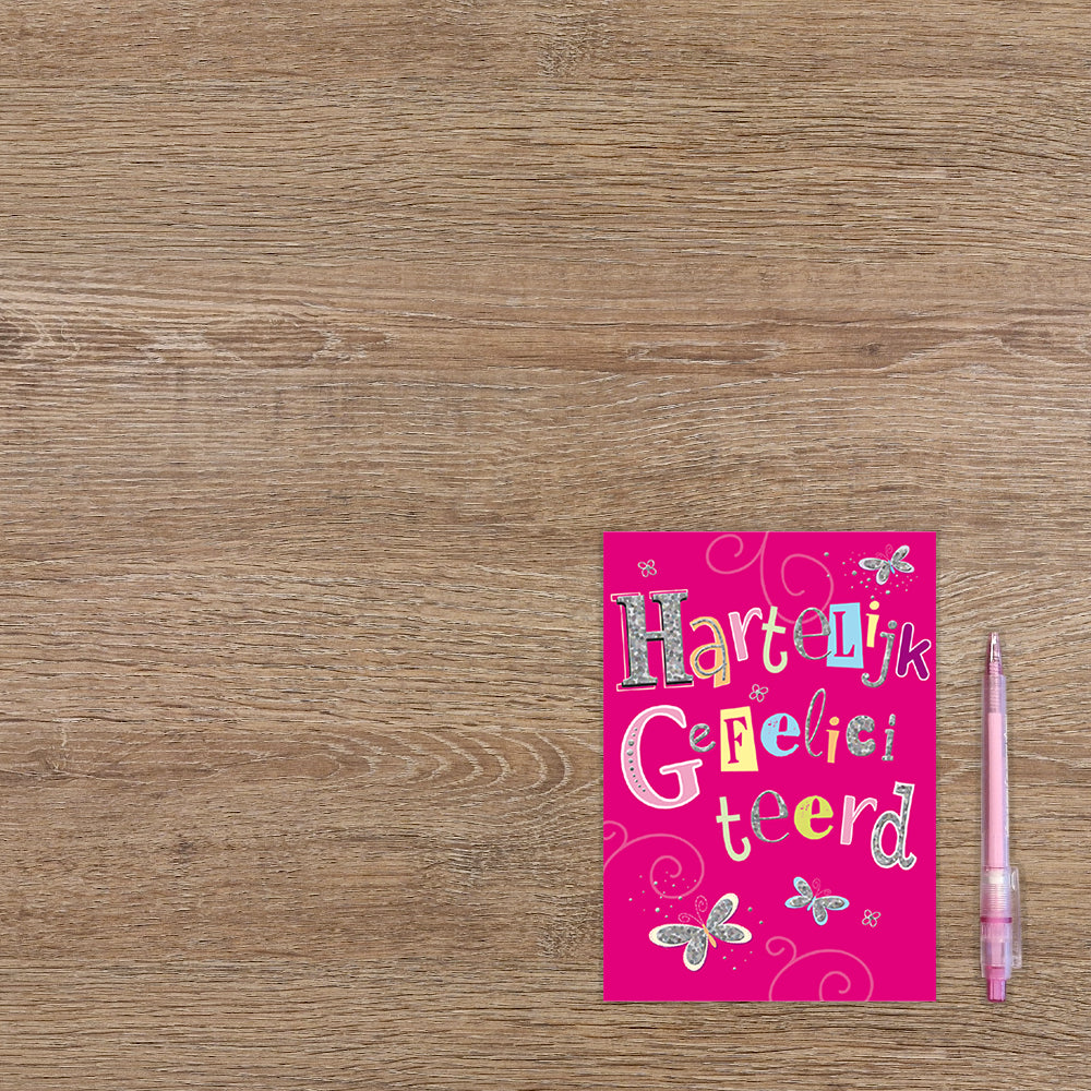 De wenskaart heeft een afmeting van x en een staande vorm. Op deze wenskaart staat de tekst: "Hartelijk gefeliciteerd" omringt door kleine vlinders in de kleuren zilver, geel en blauw, op een roze achtergrond. De binnenzijde van de wenskaart is bedrukt met een ontwerp passend bij de voorzijde van de kaart en de tekst "Geniet van deze speciale dag! Veel liefs".