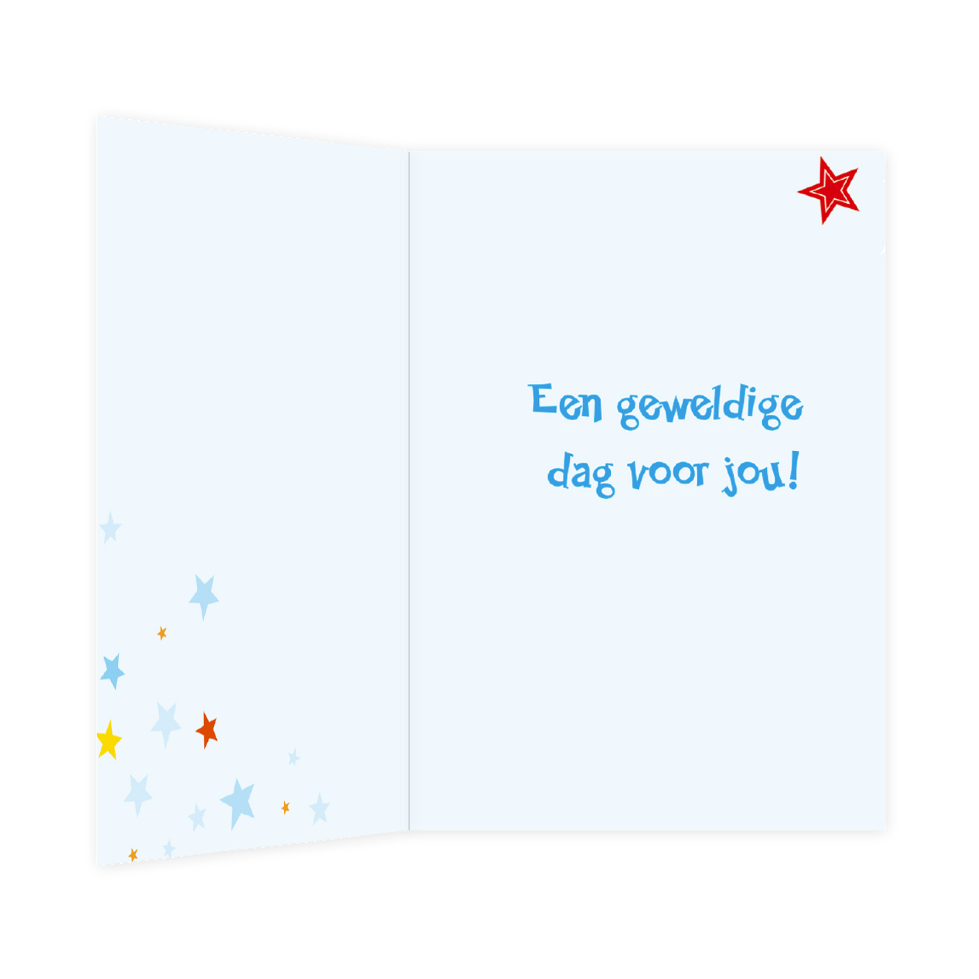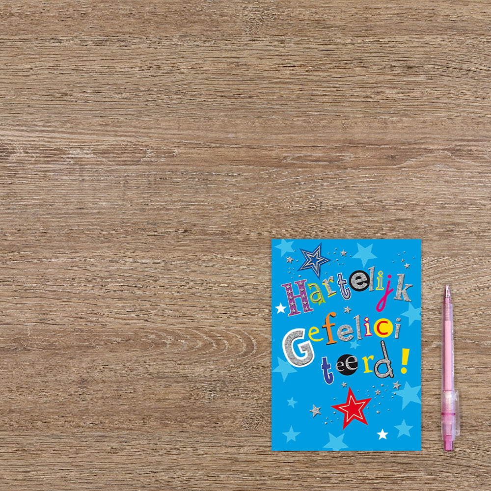 De wenskaart heeft een afmeting van x en een staande vorm. Op deze wenskaart staan sterren in de kleuren blauw, rood, wit en zilver, op een blauwe achtergrond. Over de hele kaart staat de tekst: "Hartelijk gefeliciteerd!". De binnenzijde van de wenskaart is bedrukt met een ontwerp passend bij de voorzijde van de kaart en de tekst "Een geweldige dag voor jou!".