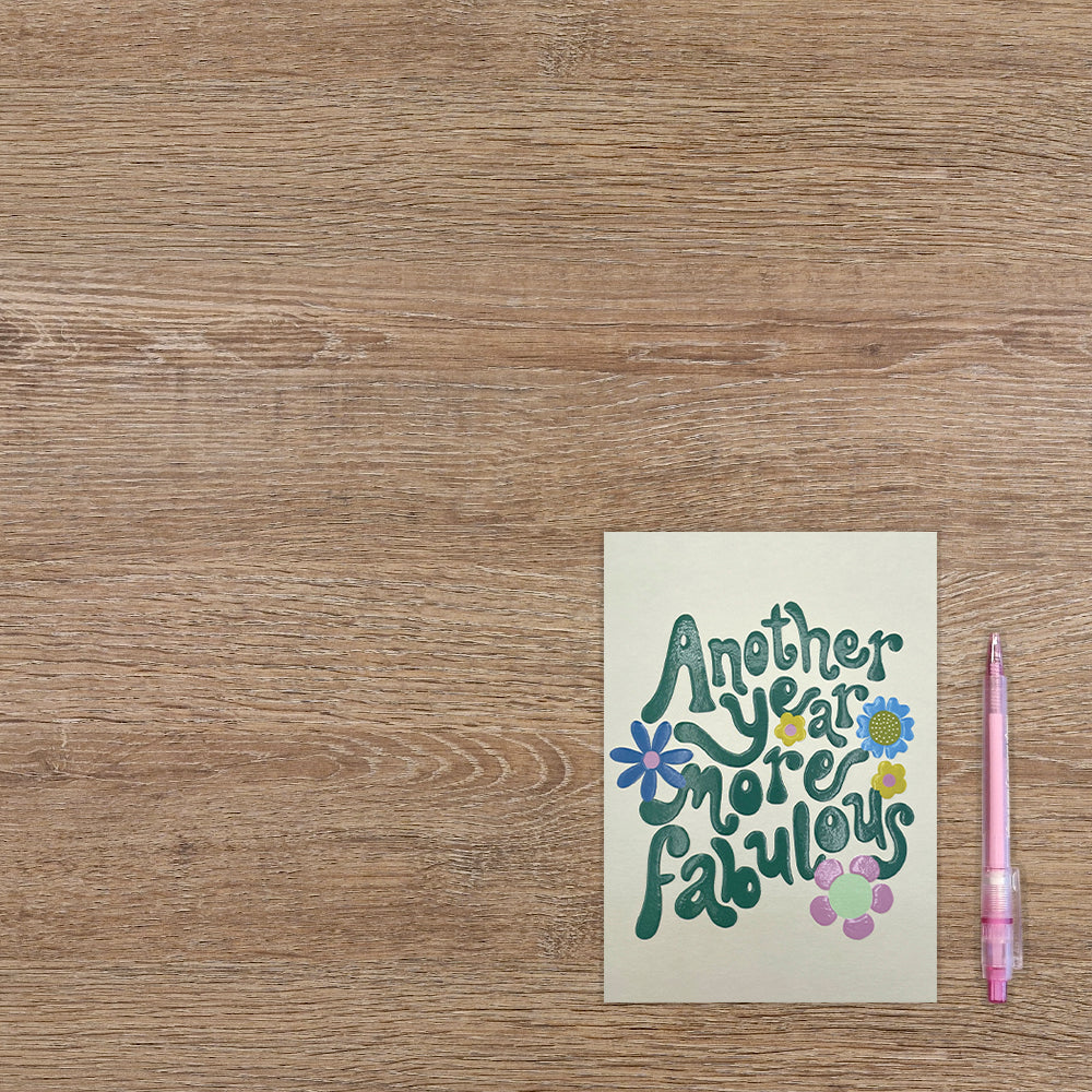 De wenskaart heeft een afmeting van x en een staande vorm. Op deze wenskaart staat de tekst: "Another year moren fabulous" omringt door bloemen. De binnenzijde van de wenskaart is blanco wat voldoende ruimte geeft om een persoonlijke boodschap te schrijven .
